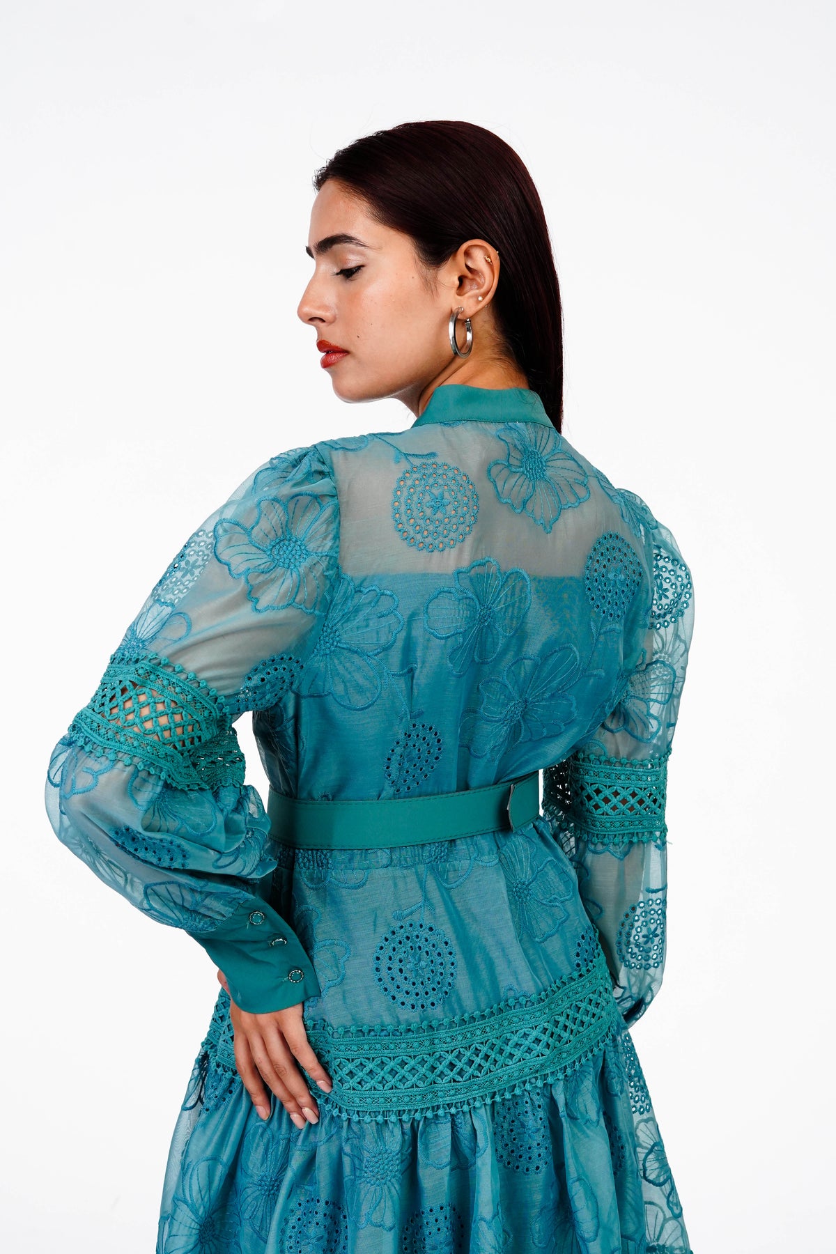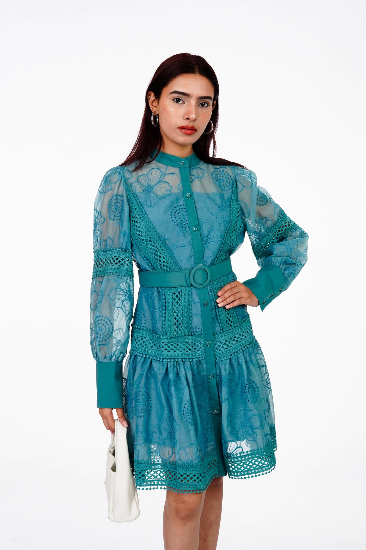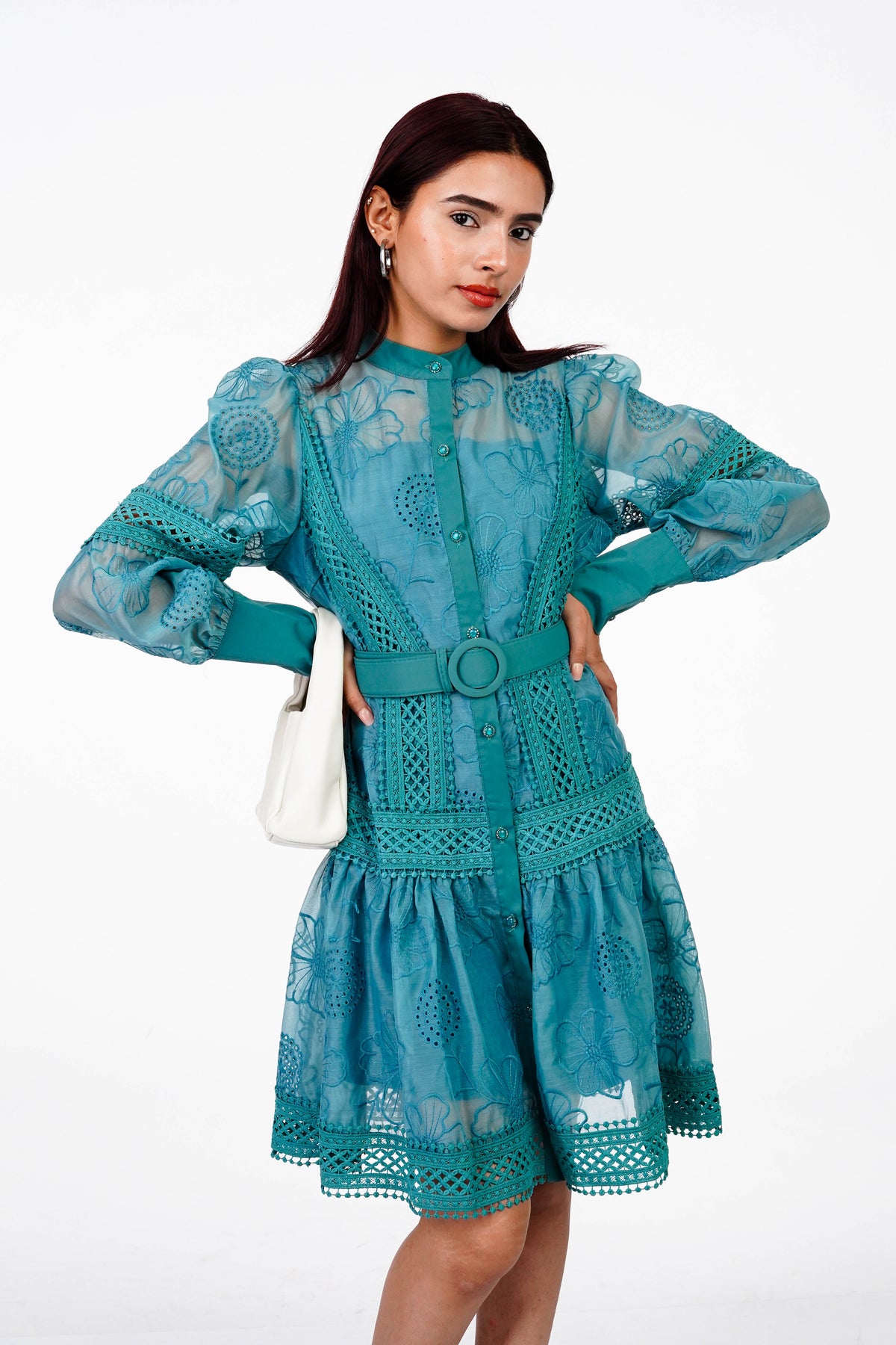 Elevate your wardrobe with our Signature Teal Cutwork Dress — a bold blend of vintage charm and modern structure. Featuring intricate cutwork embroidery, tonal floral detailing, and a matching waist belt to define your silhouette, along with a back zipper for closure, this dress is a true head-turner. It's sheer puffed sleeves and flared hem add a soft contrast to the sharp construction, making it a perfect balance of romantic and refined.