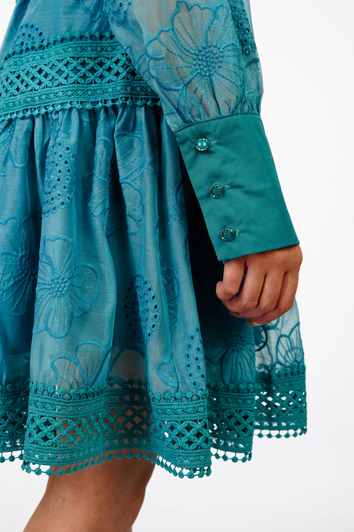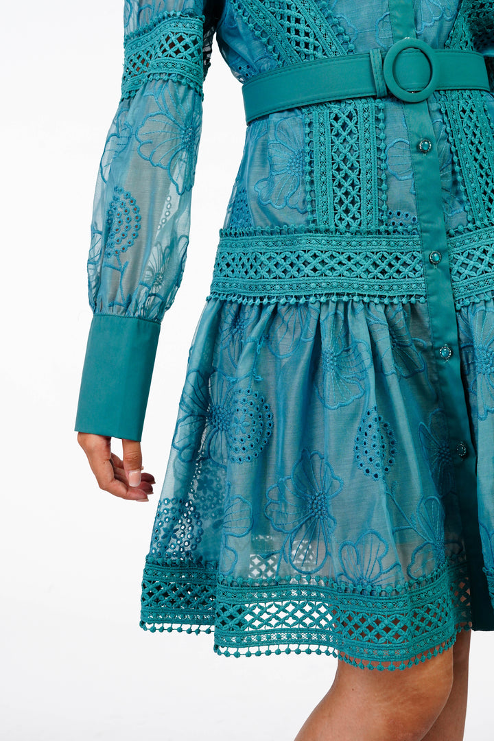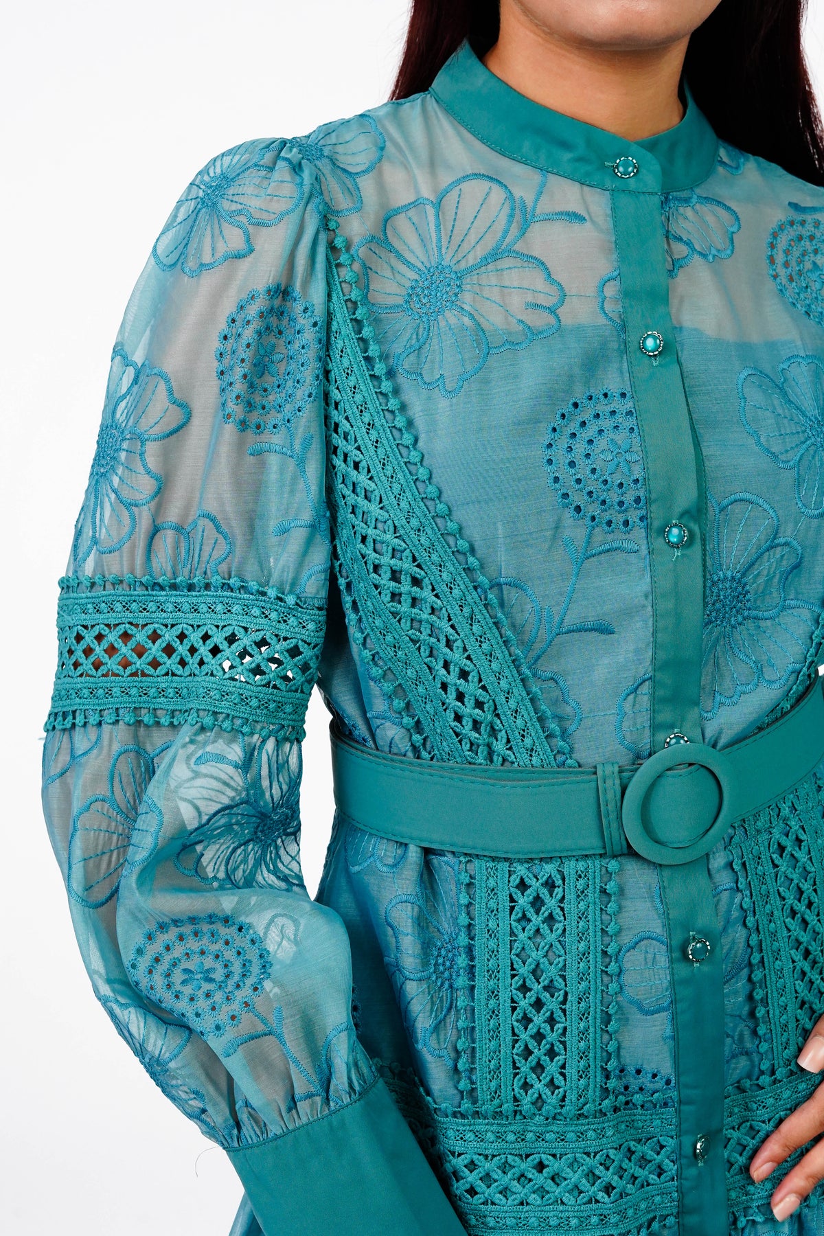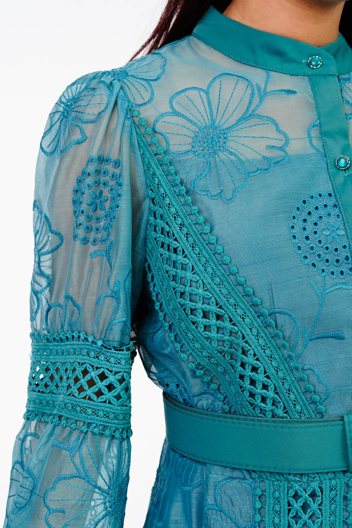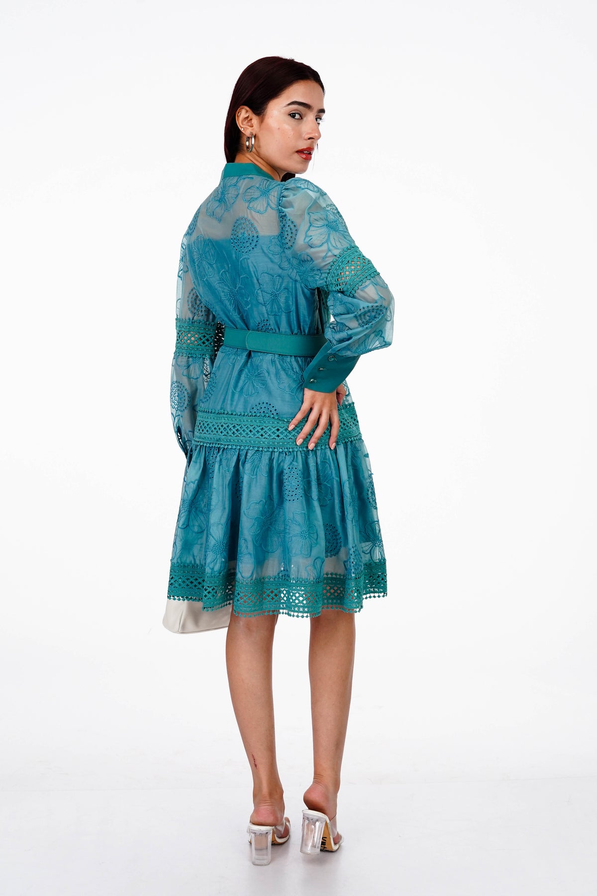 Elevate your wardrobe with our Signature Teal Cutwork Dress — a bold blend of vintage charm and modern structure. Featuring intricate cutwork embroidery, tonal floral detailing, and a matching waist belt to define your silhouette, along with a back zipper for closure, this dress is a true head-turner. It's sheer puffed sleeves and flared hem add a soft contrast to the sharp construction, making it a perfect balance of romantic and refined.