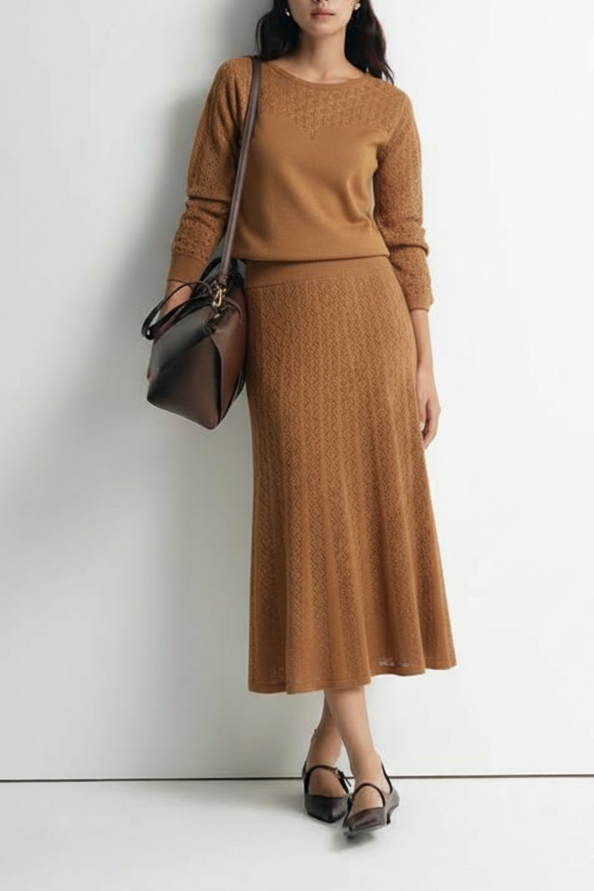 The Skin Muse Knit Co-ord Set blends comfort with timeless elegance. Featuring a lightweight knit top and matching midi skirt, this set showcases intricate lace-pattern detailing for a refined yet modern look. The top is designed with a round neckline and full-length sleeves, while the skirt features a ribbed waistband for a flattering, comfortable fit.