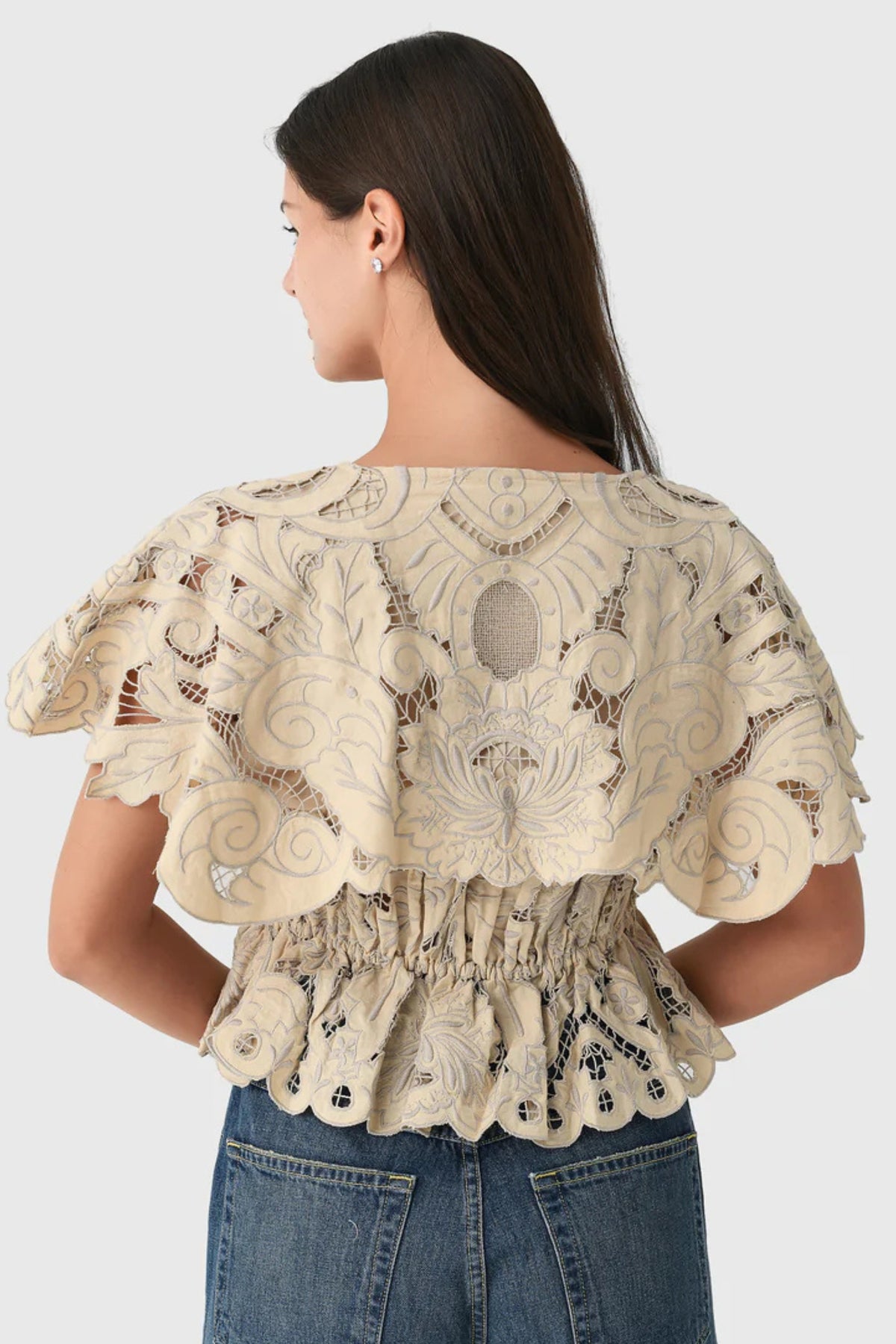 • Details: All-over intricate lace, flutter sleeves, adjustable front tie with tassels, and scalloped hemline
