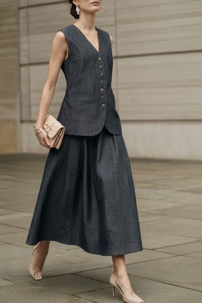 This Denim Waistcoat Skirt Co-ord Set features a Denim Waistcoat with button-down closure and front faux pockets. It is paired with a long Pleated skirt with side pockets and a side zipper for comfortable closure.