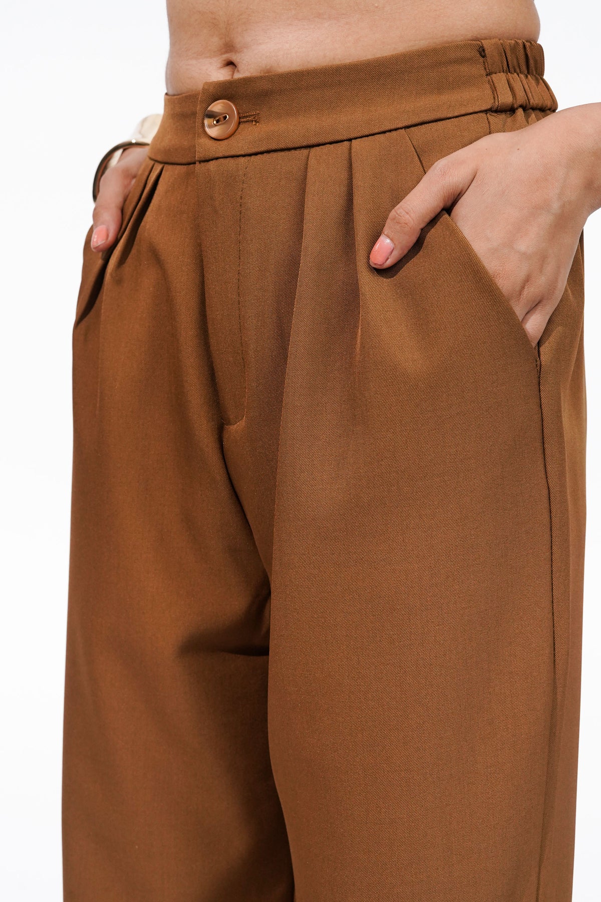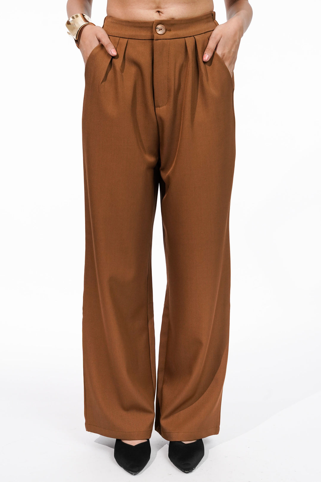 Tailored brown suit set with button closure and pleated trousers