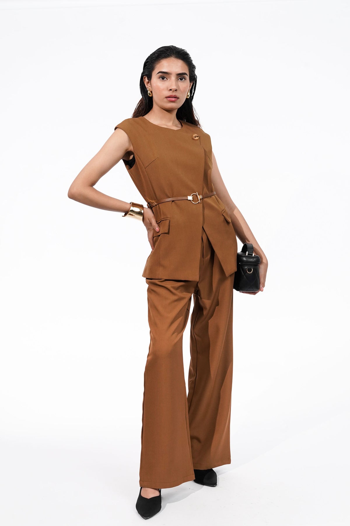 This Maple Brown Asymmetric Waistcoat Co-ord Set features an asymmetric Waistcoat expertly stitched in suiting fabric. It has a top button closure, front flap pockets, tailored clothing, and belt loops. The coat is paired with tailored flared pants with an elasticated waistband at the back and button fly at the front, pleats at the waist, and front pockets. The set is accompanied by a sleek adjustable belt with golden accents.