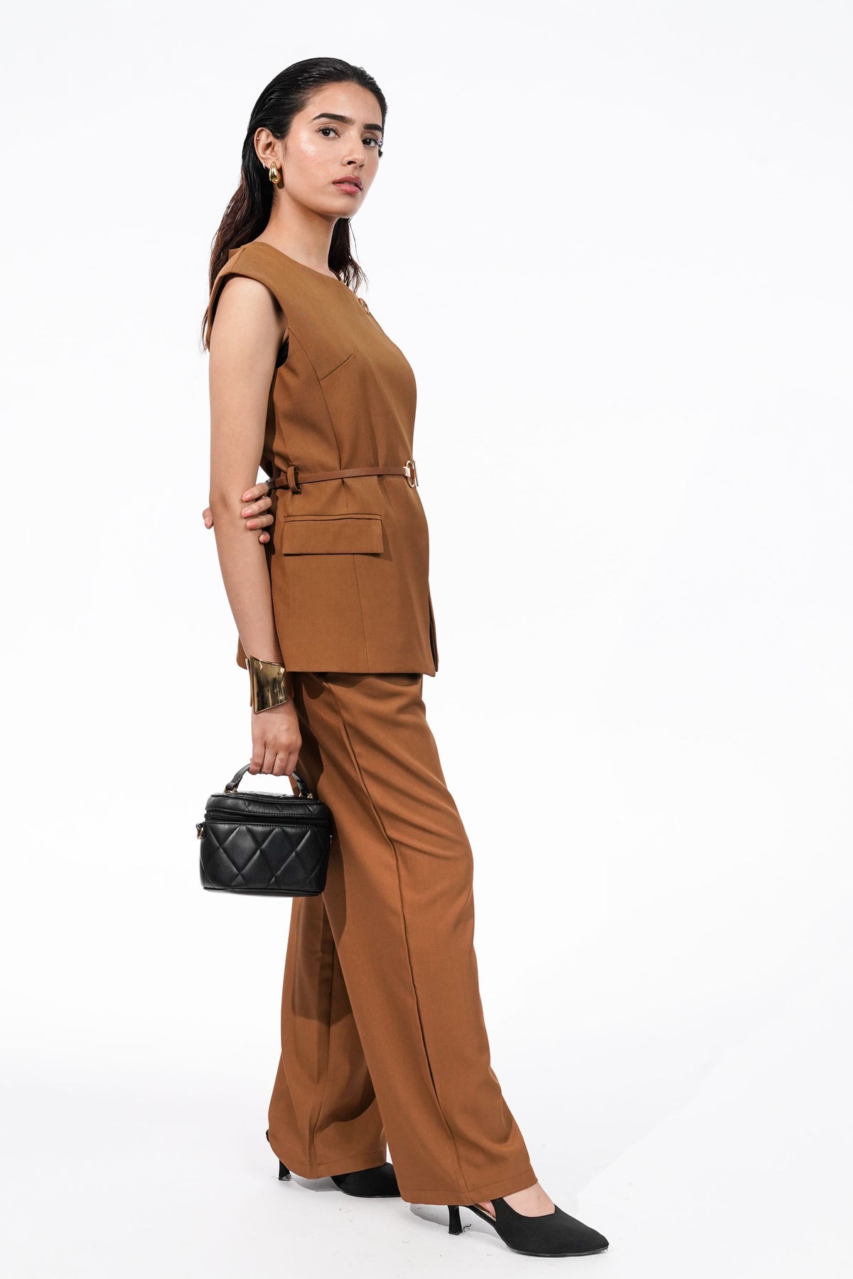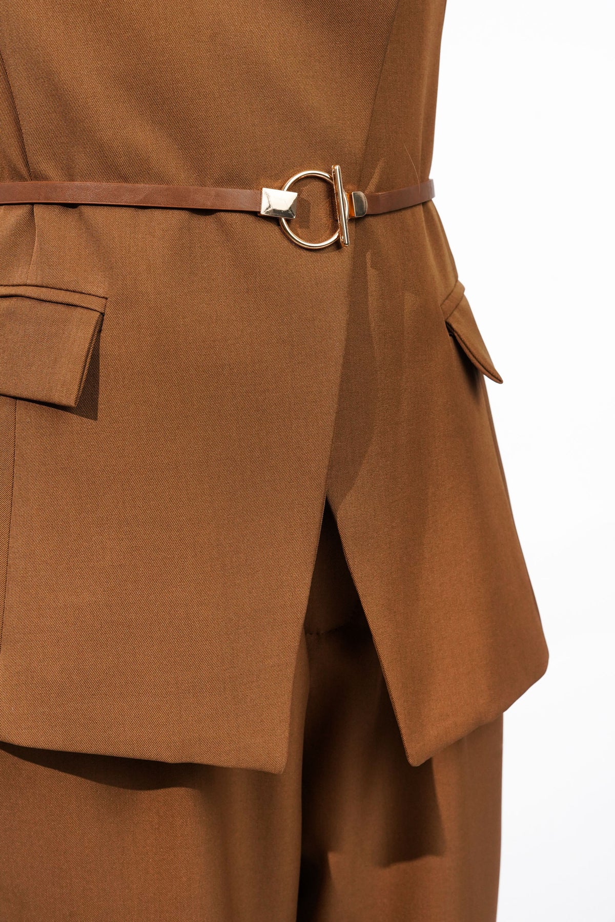 Formal co-ord with flap pockets and golden-accented belt