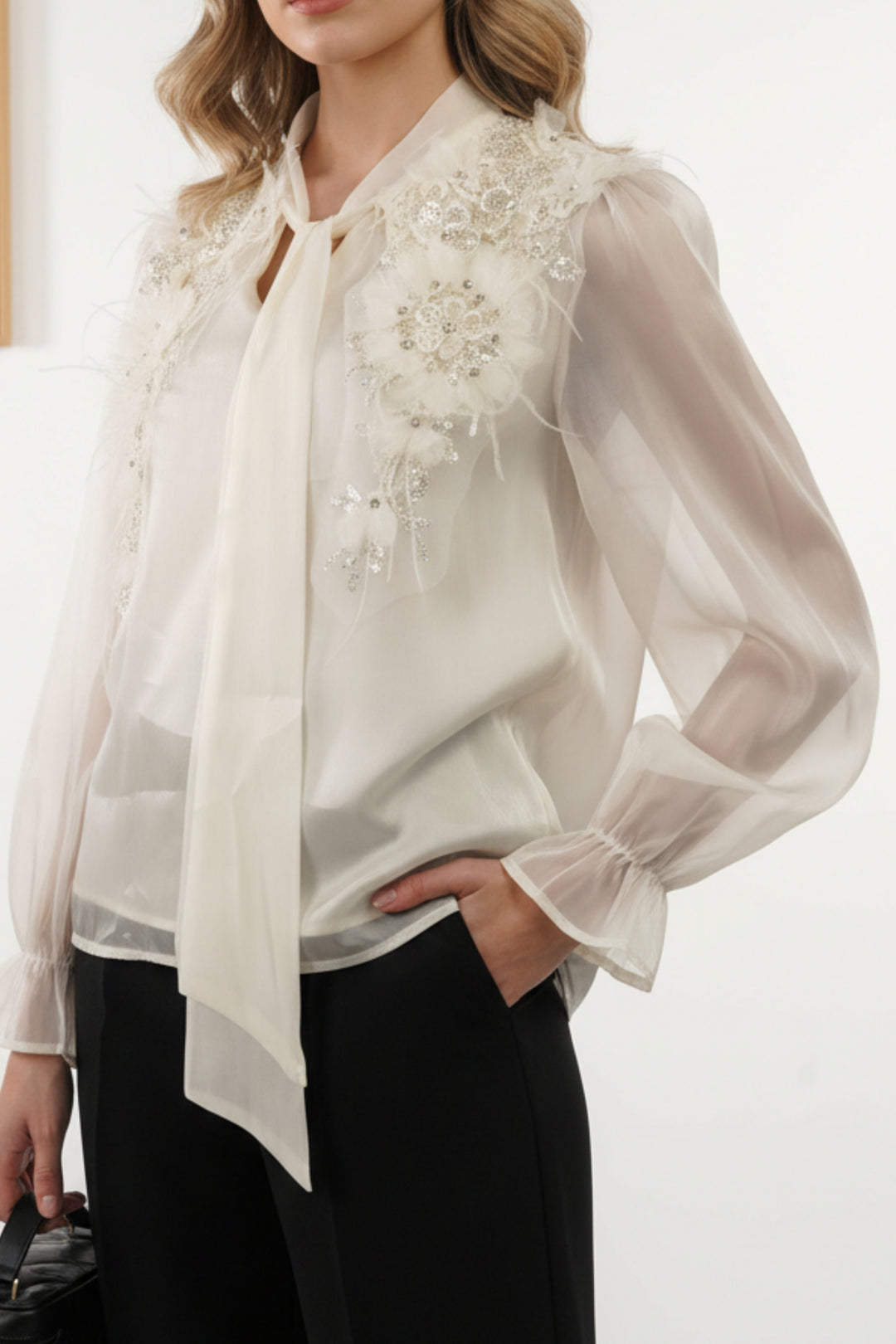 Our Organza Flower Top is an ode to the lovely flowers that cover its surface in delicate appliqué, seeming to float on the sheer fabric. A perfect ode to spring. This transcends from a perfect daytime look piece into an absolutely divine evening setting. It will provide even the most intense blazer with that charming and lively energy to be a perfect garden party or wedding pick, courtesy of its delicate floral detailing.