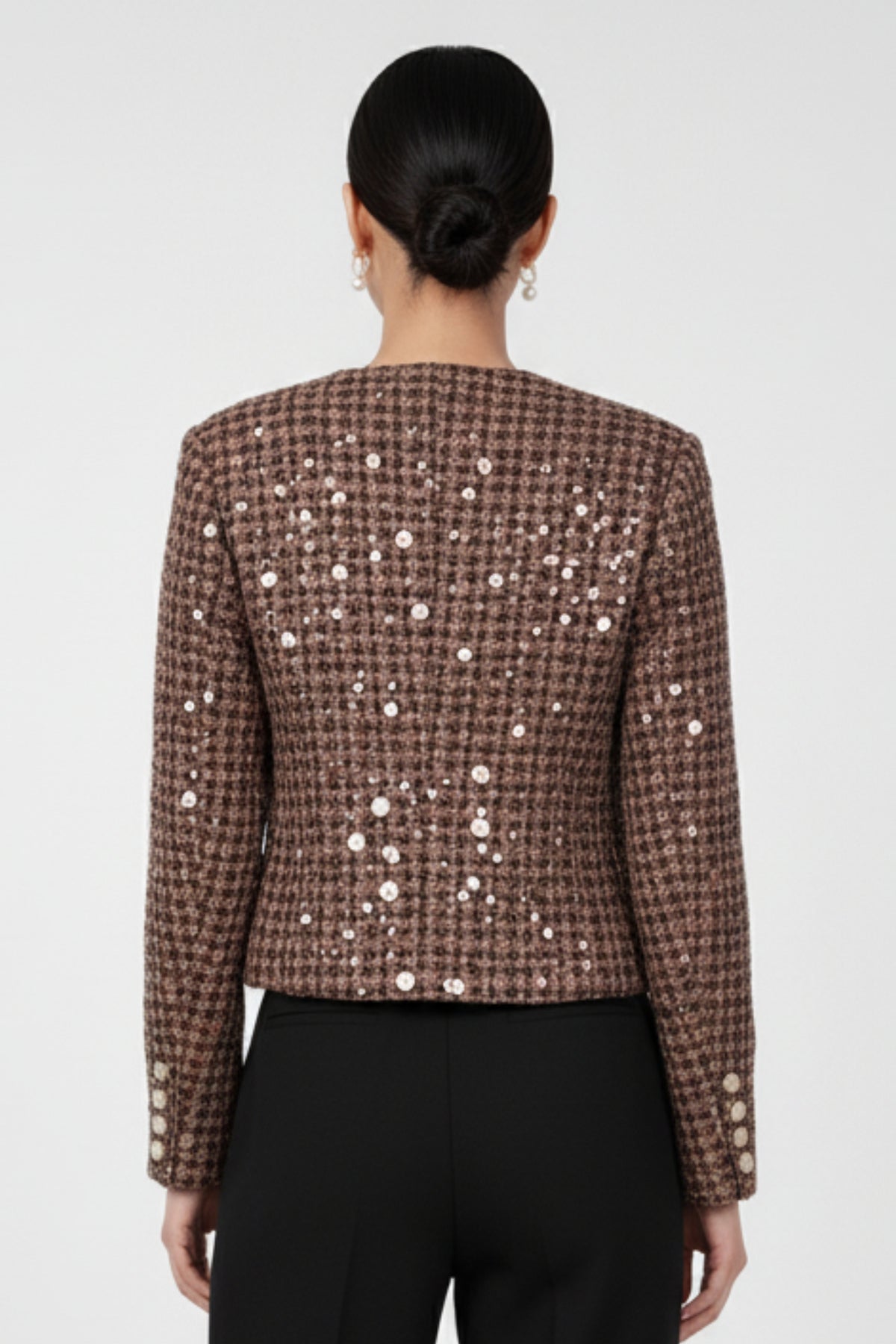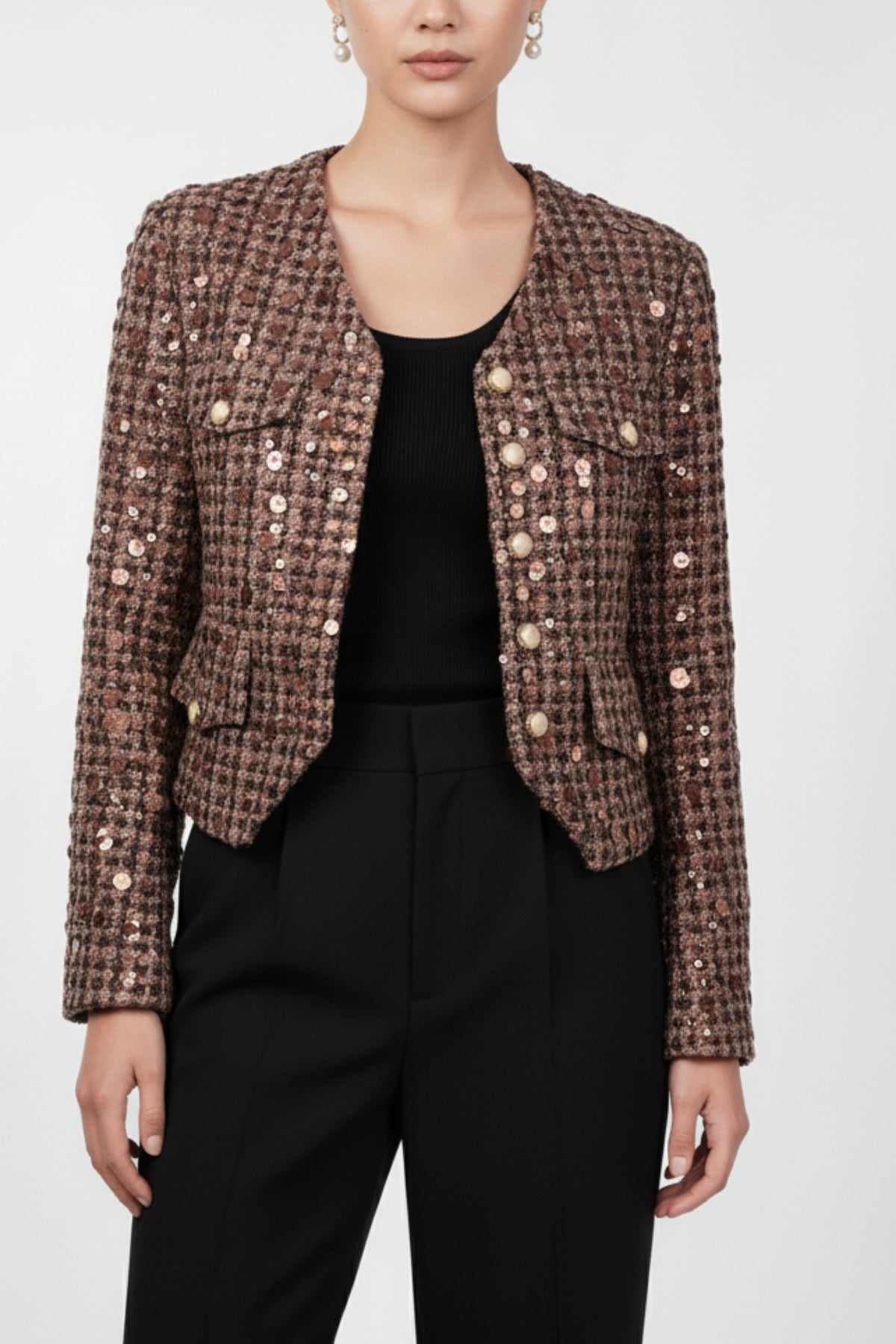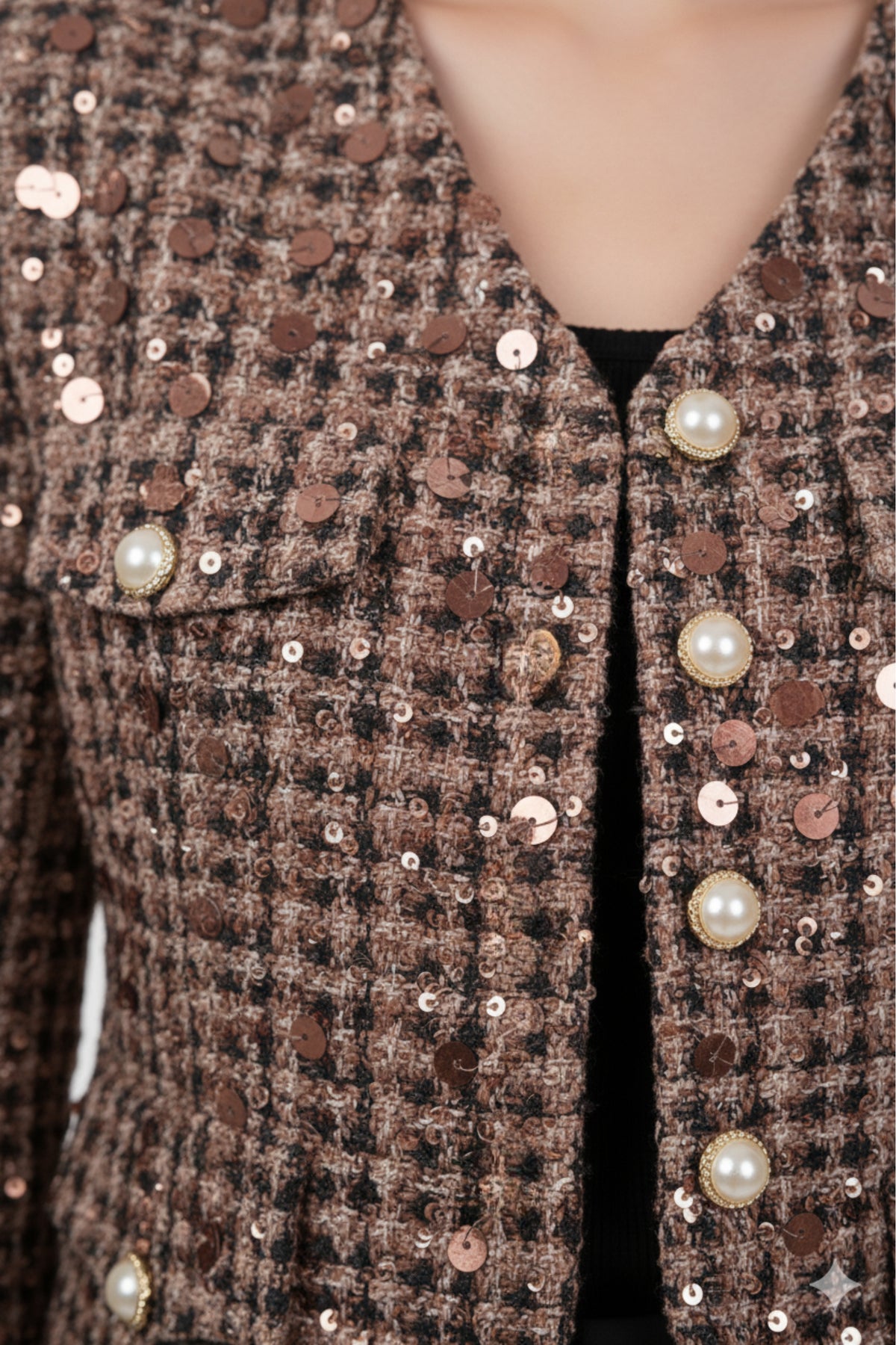 This stylish brown tweed blazer combines classic sophistication with a modern twist. Featuring a flattering V-neck, waistcoat-inspired hem, and metallic brown sequin detailing, this single-breasted coat adds a touch of sparkle to a timeless fabric. The heavy tweed construction ensures both warmth and structure, making it perfect for cooler days. For a chic look, pair it with tailored trousers and ankle boots, or dress it up with a sleek skirt and heels for an evening out. Add a bold clutch to elevate the ensemble and embrace a blend of classic elegance with contemporary flair.