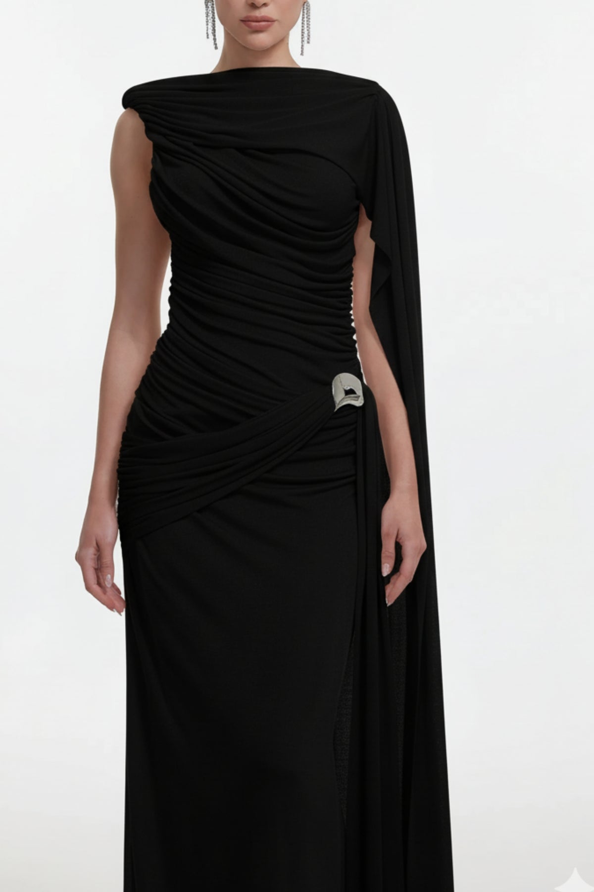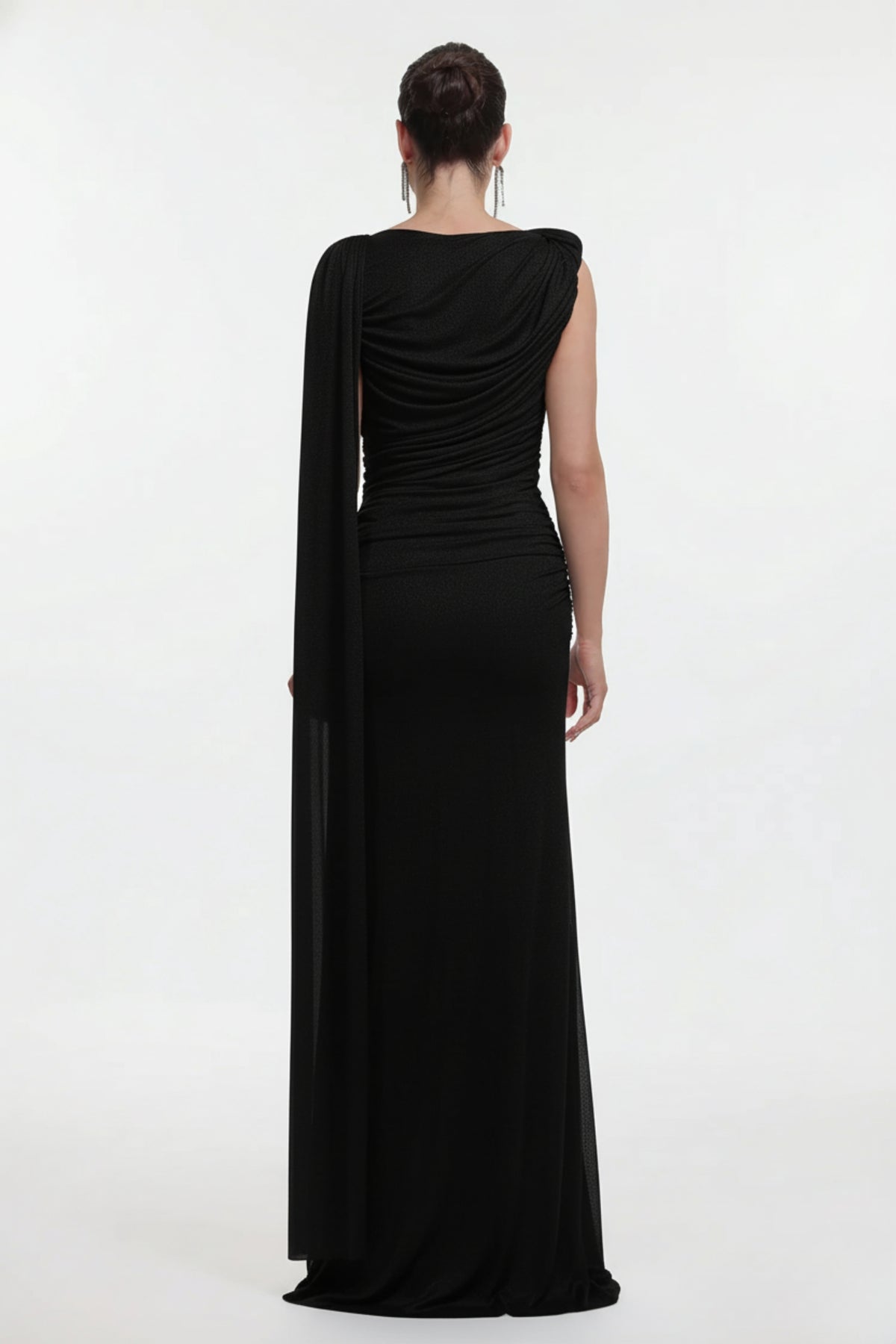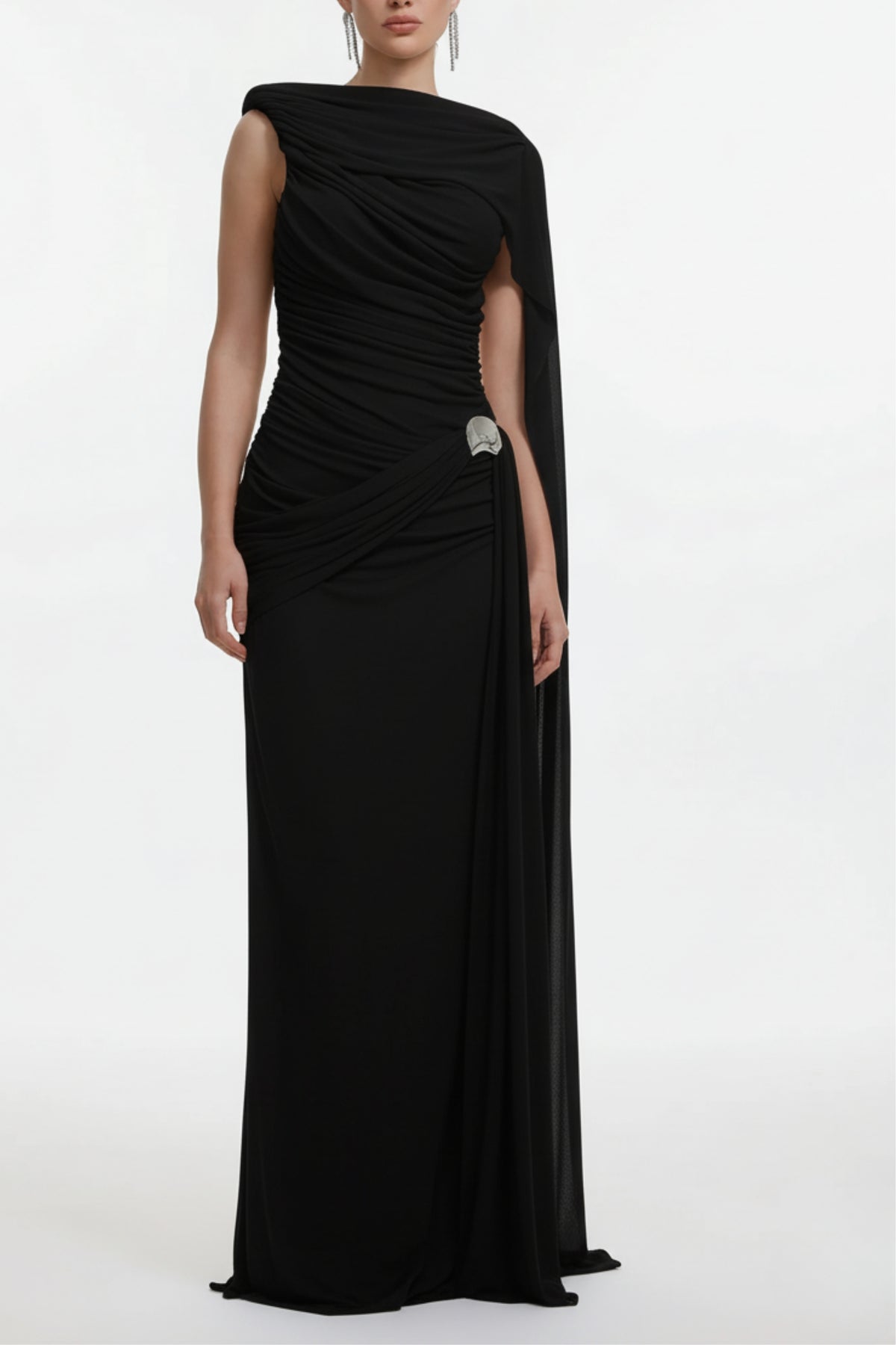 The Black Draped Bodycon Maxi Dress  delivers striking elegance with its asymmetric neckline, flowing cape sleeve, and flattering ruched side detail that enhances the silhouette. Designed for a sleek, sculpted fit, the high-stretch fabric offers both comfort and refined structure, making it ideal for long celebrations and special occasions. An invisible side zipper ensures a seamless finish while maintaining the clean, sophisticated lines of the design.