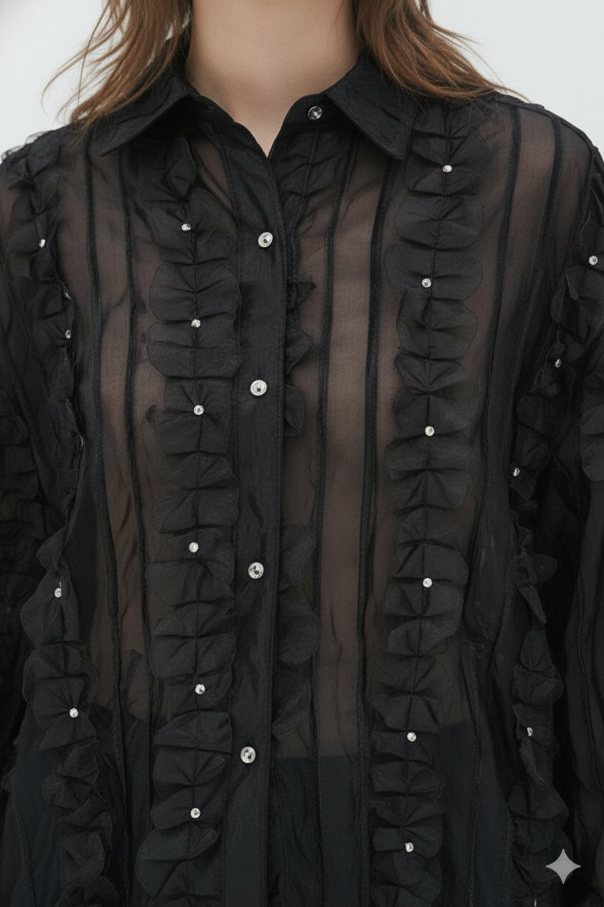 - Details: Black sheer shirt with vertical floral applique panels and crystal-style buttons