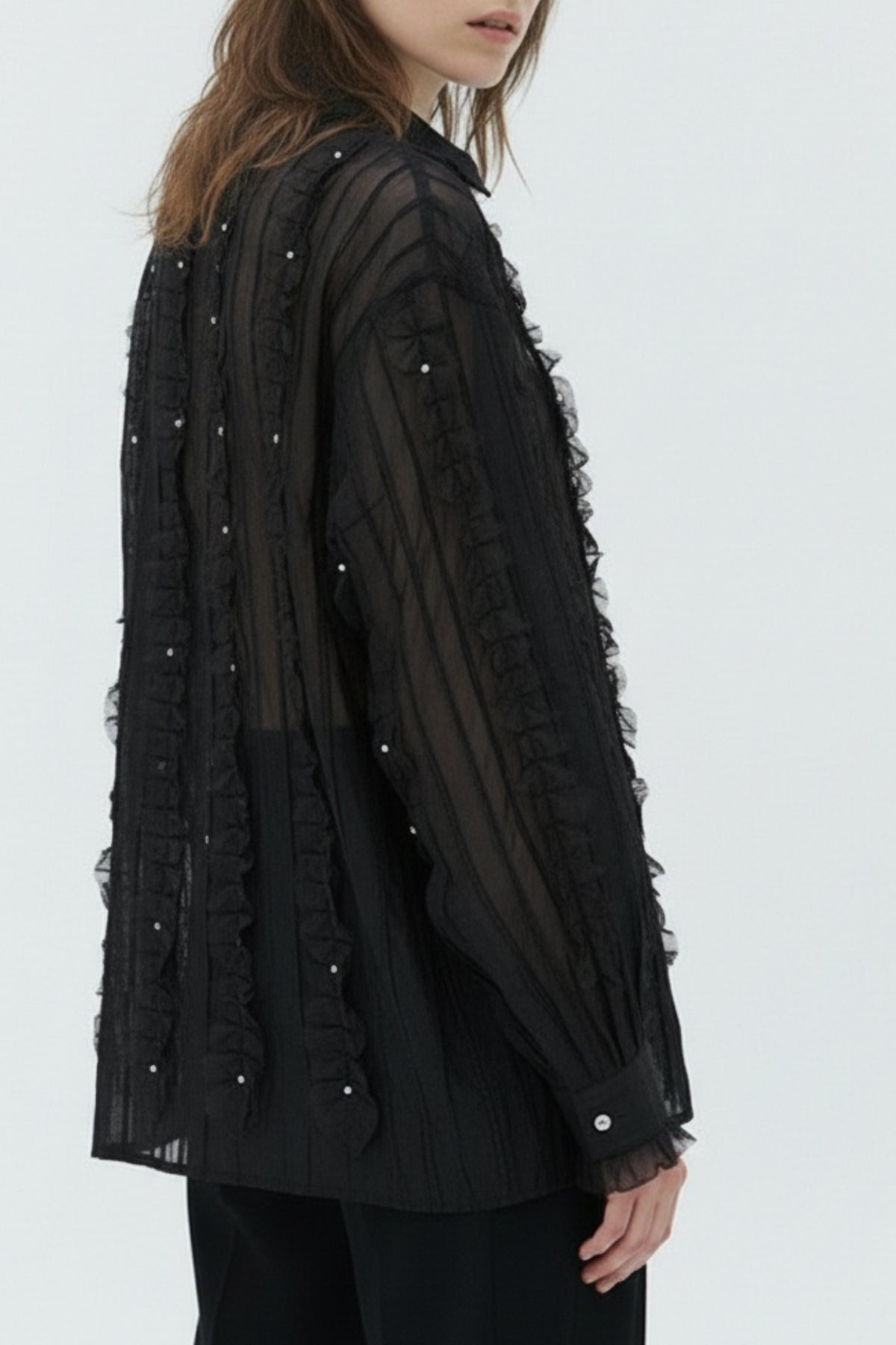 Delicate yet striking – the Applique Black Sheer Shirt is a romantic reinterpretation of classic shirting. Crafted from sheer fabric and adorned with cascading floral appliqués and crystal button detailing, this shirt blends softness with sophistication.