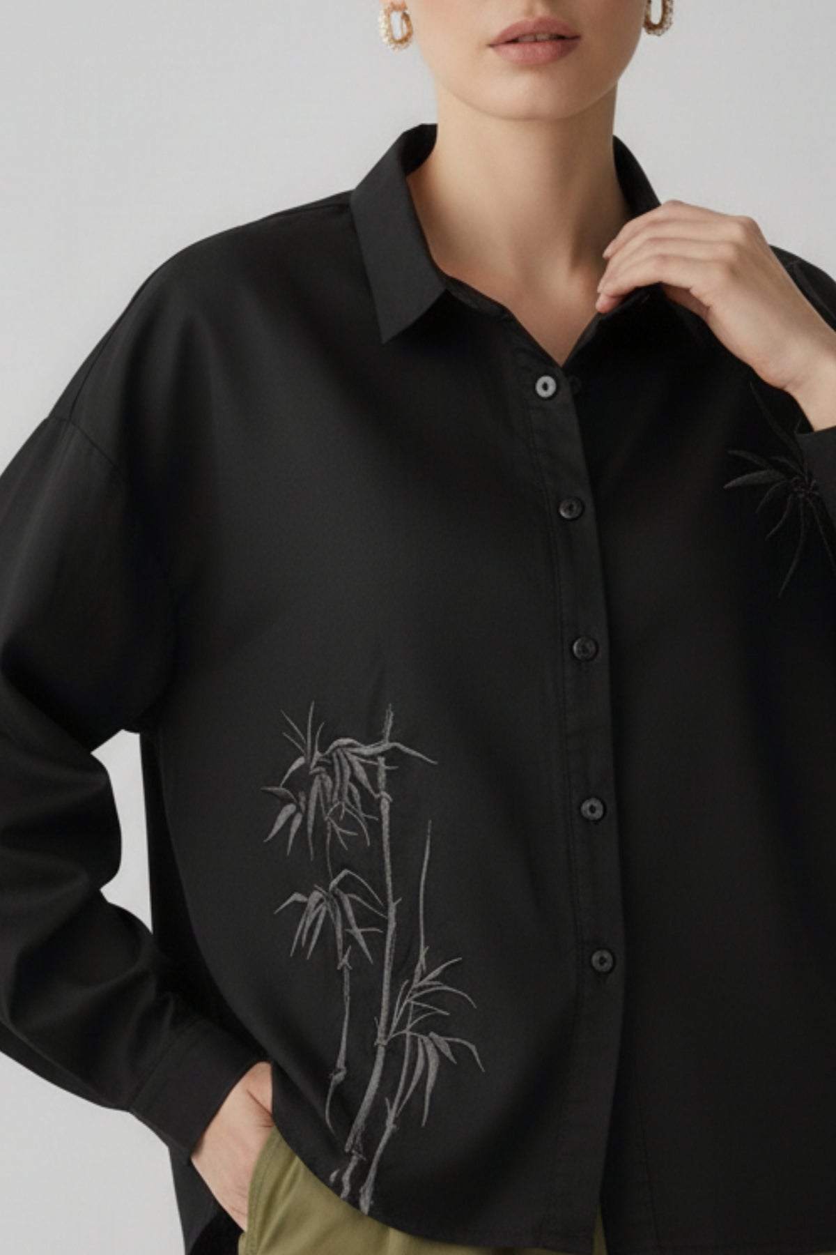 Elevate your style with this black full-sleeve shirt featuring a classic standard collar. Its soft fabric ensures comfort, while the stunning bamboo design embroidery adds a touch of elegance. Perfect for both casual and smart-casual occasions, it effortlessly blends contemporary charm with timeless appeal.
