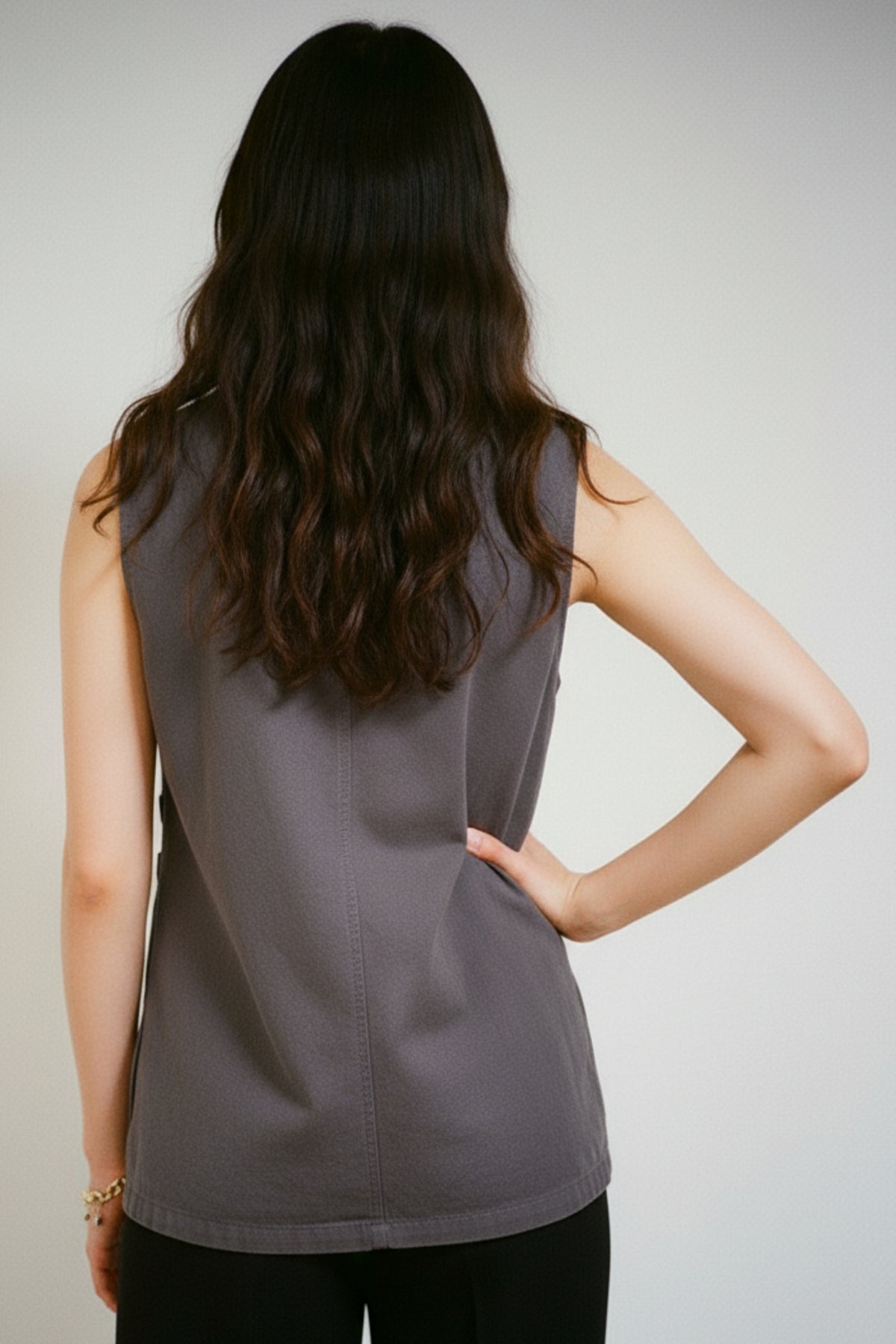 Introducing our "Military Double-Breasted Vest." This sophisticated attire showcases black snap button closure, offering a chic contrast. With its rounded neckline and oversized silhouette, it exudes contemporary sophistication. Adorned with dual patch pockets and sleek welt detailing, it's a standout piece in modern fashion.
