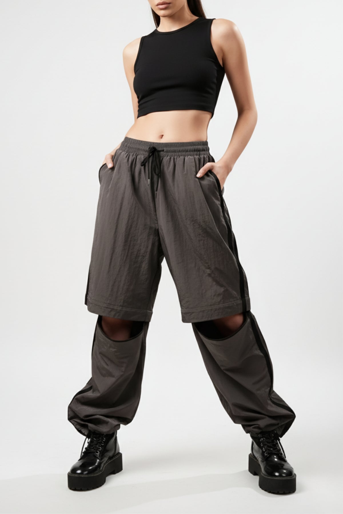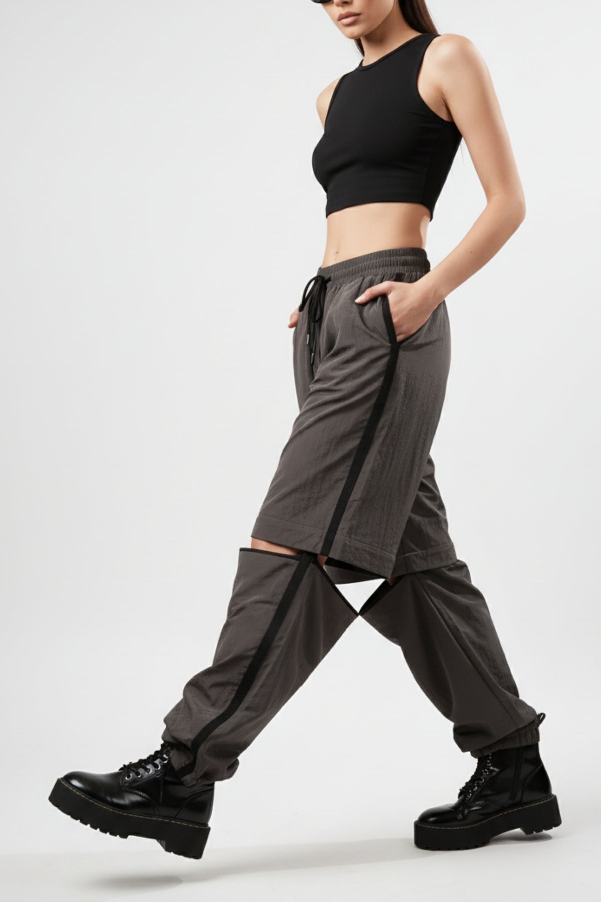 Introducing our Iron Grey Convertible Bottoms: the ultimate combination of versatility and style. Featuring sleek black side stripes, convenient side and patch pockets, and an elasticated waist with a drawstring, these bottoms effortlessly transform into joggers with toggles at the hem, and into shorts with a zipper attachment.