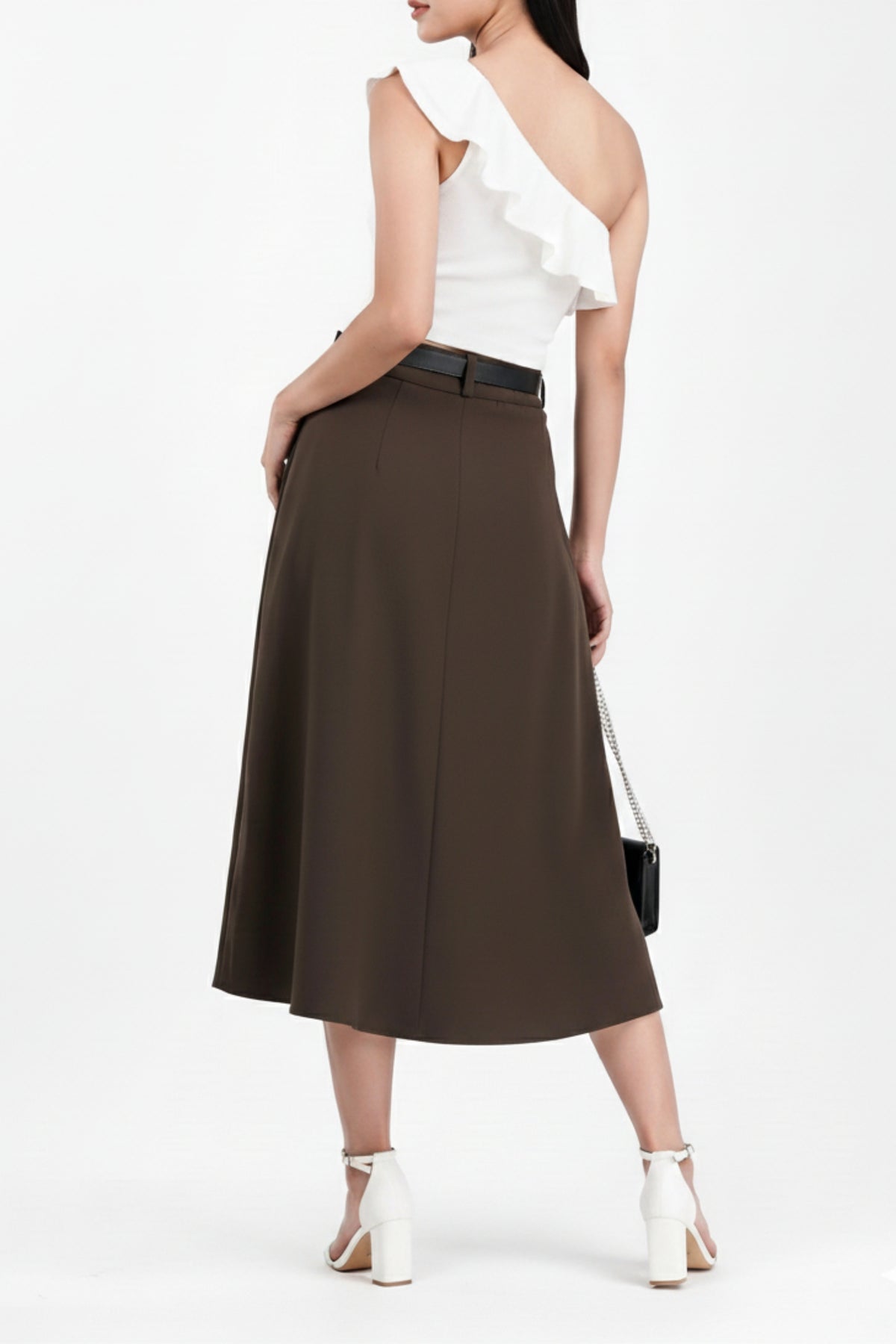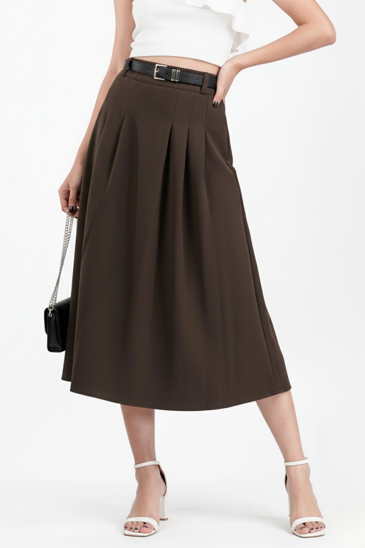 This Hazel Brown Suede mid-length skirt features elegant knife pleats for a flattering, structured look. It comes with a partial elasticated back belt for a comfortable, adjustable fit and a separate black belt for added styling options. Perfect for both casual and semi-formal occasions, this skirt offers a chic, versatile addition to any wardrobe.