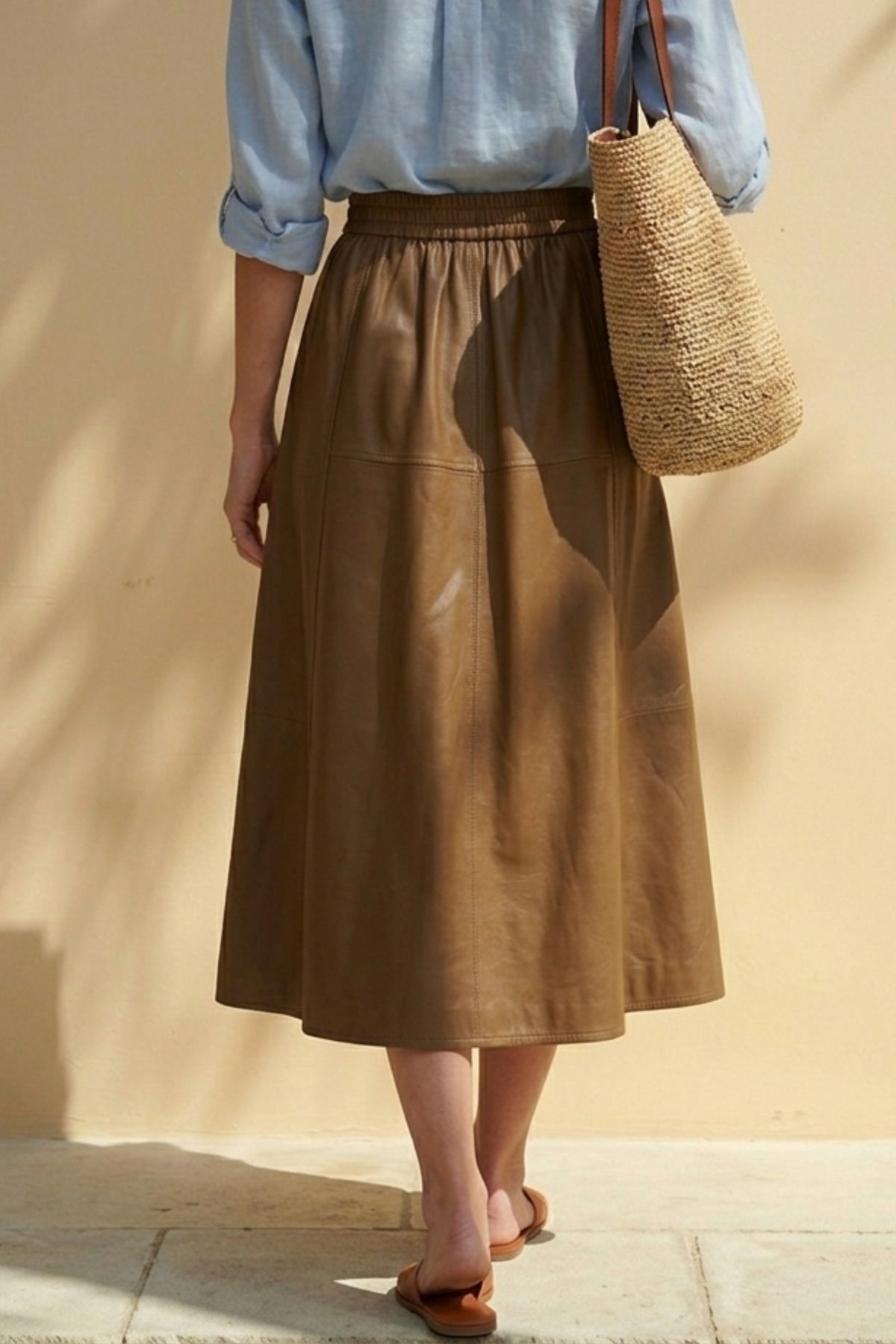 This rustic brown faux leather skirt features paneled stitching and an elasticated waist for a comfortable, adjustable fit. Its sleek design and detailed stitching add a touch of rustic charm, making it perfect for both casual and dressed-up looks.