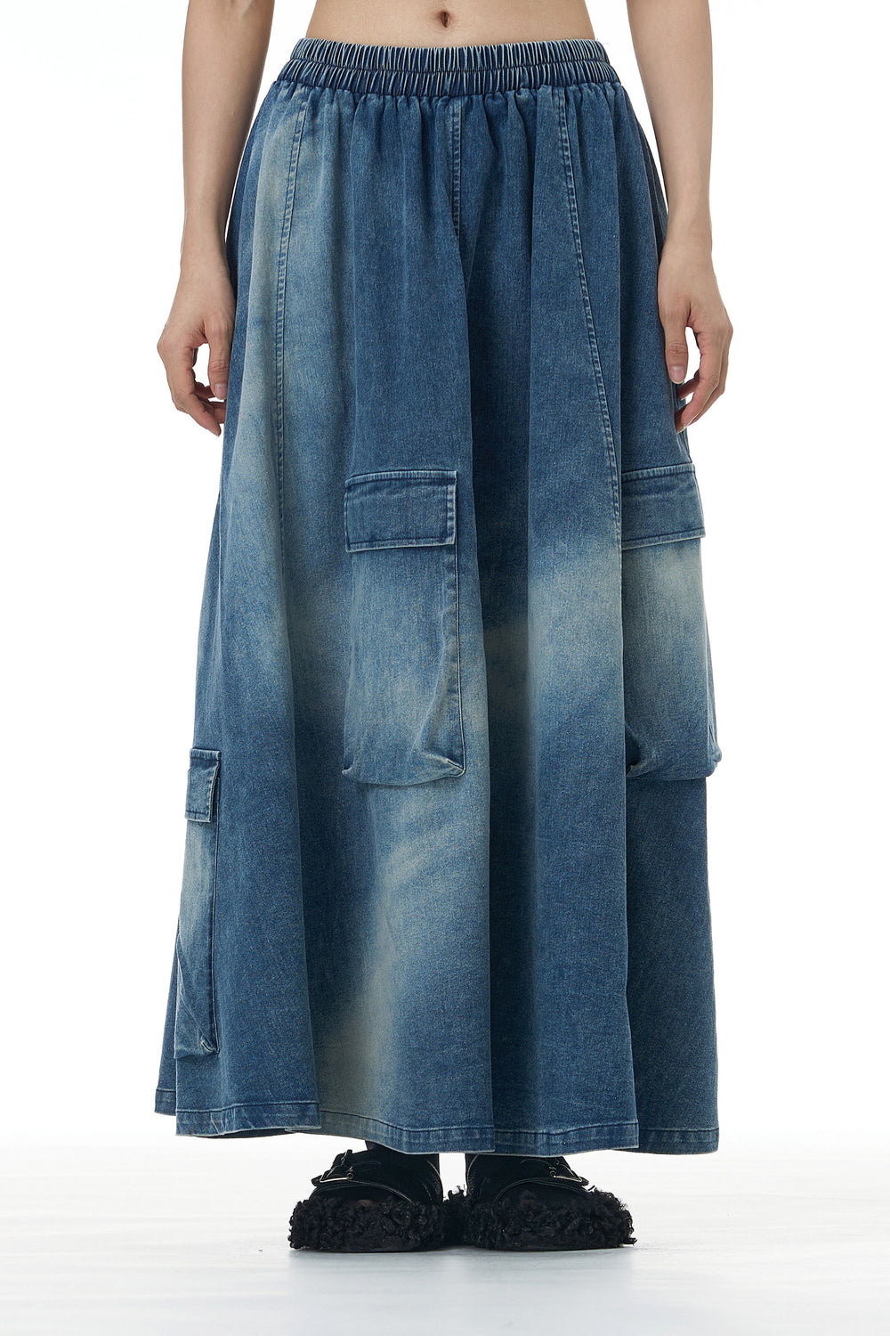 This Denim blue skirt features an elasticated waistband, offering a comfortable fit from sizes XS to XL. Designed with functional cargo pockets and a stylish faded effect, it blends utility with a modern, edgy look. Perfect for casual outings or adding a touch of street style to your wardrobe.
