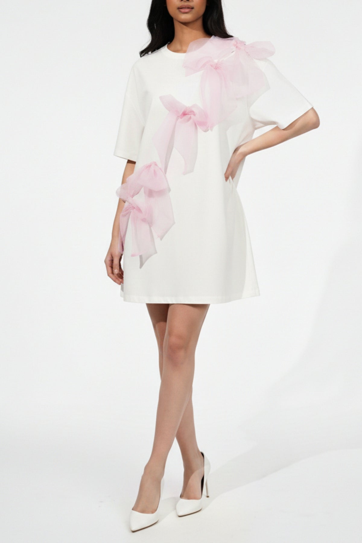 The Bonita Bows White T-Shirt is a playful twist on a wardrobe essential. Crafted from a soft cotton-blend fabric, it features an oversized fit with short sleeves for everyday comfort. Eye-catching pink bows in organza & net, diagonally placed across the front along with slight cutouts that add a unique & feminine charm.
