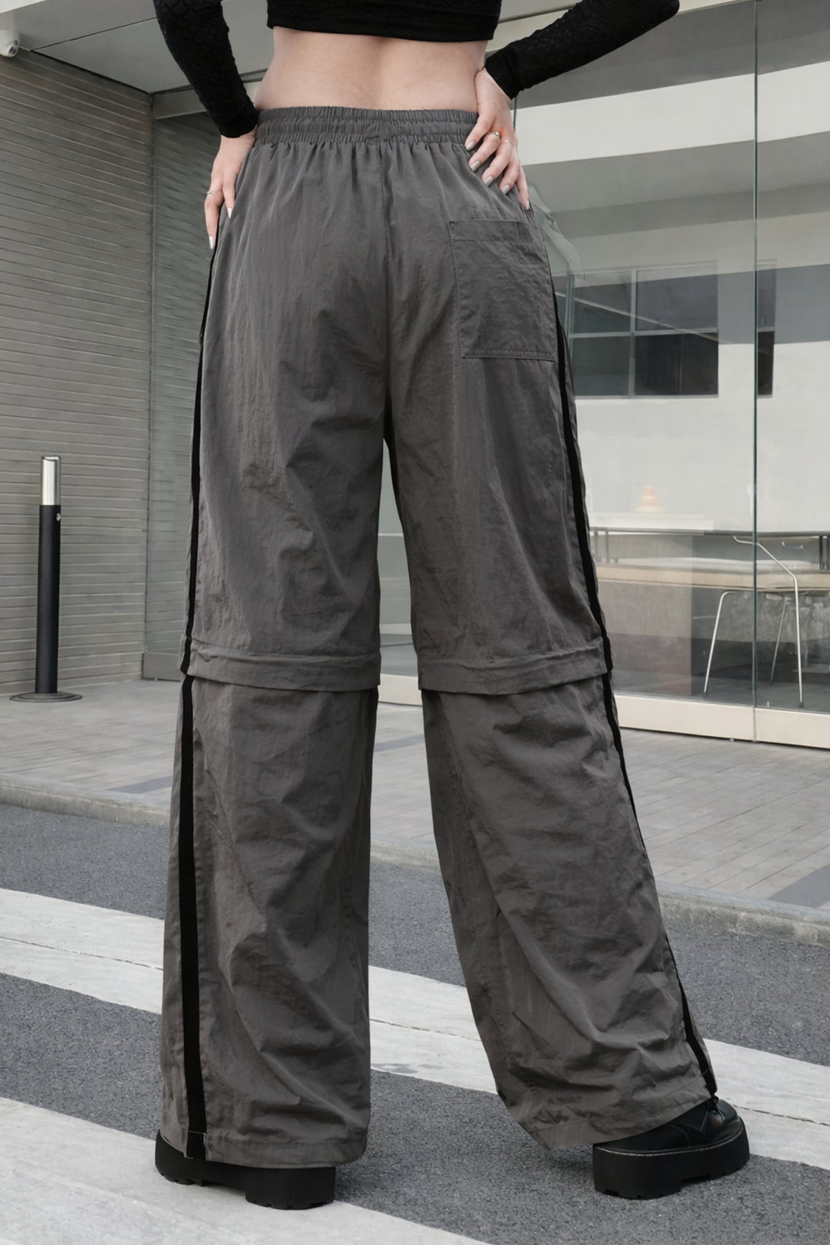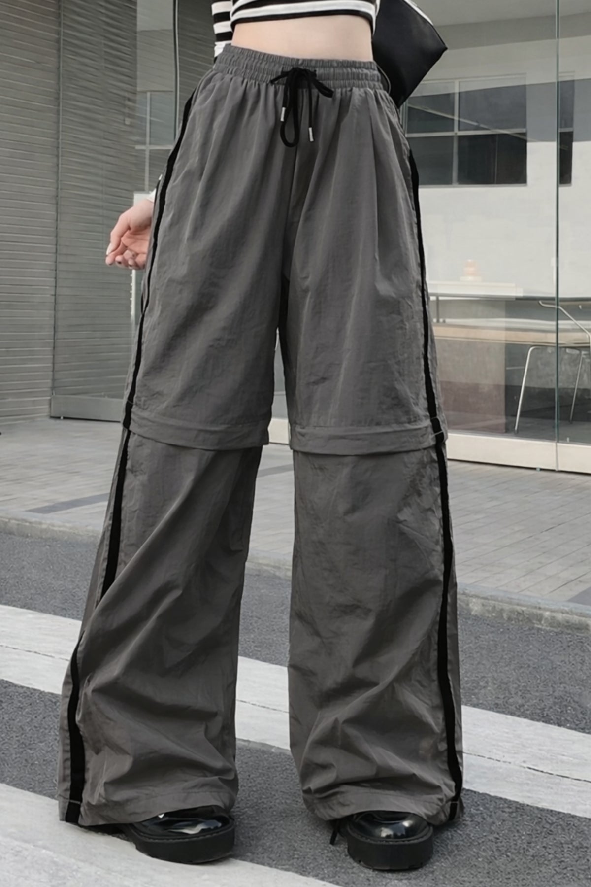 Introducing our Iron Grey Convertible Bottoms: the ultimate combination of versatility and style. Featuring sleek black side stripes, convenient side and patch pockets, and an elasticated waist with a drawstring, these bottoms effortlessly transform into joggers with toggles at the hem, and into shorts with a zipper attachment.