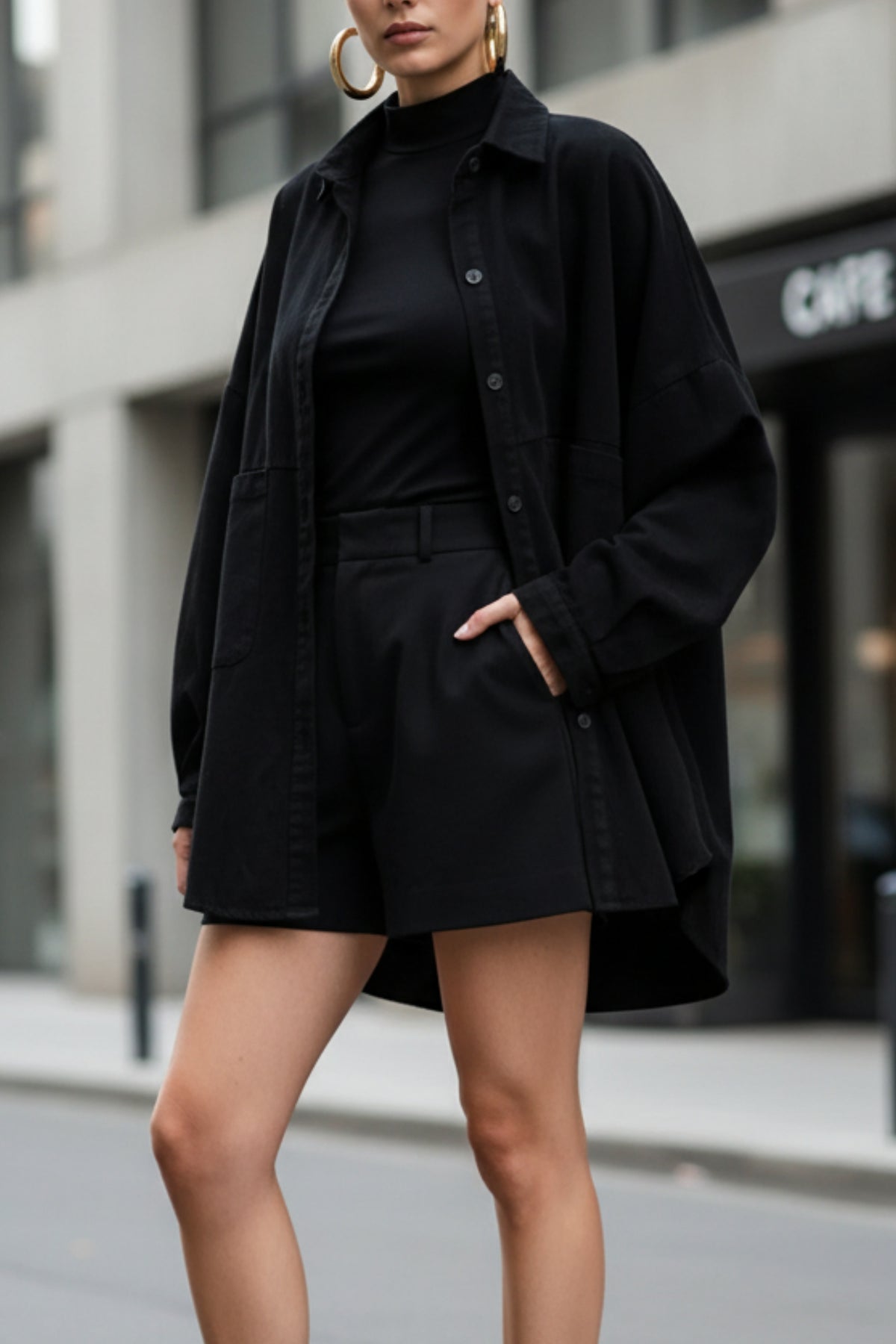“The shacket features a stylish oversized fit, offering both comfort and a modern silhouette.”