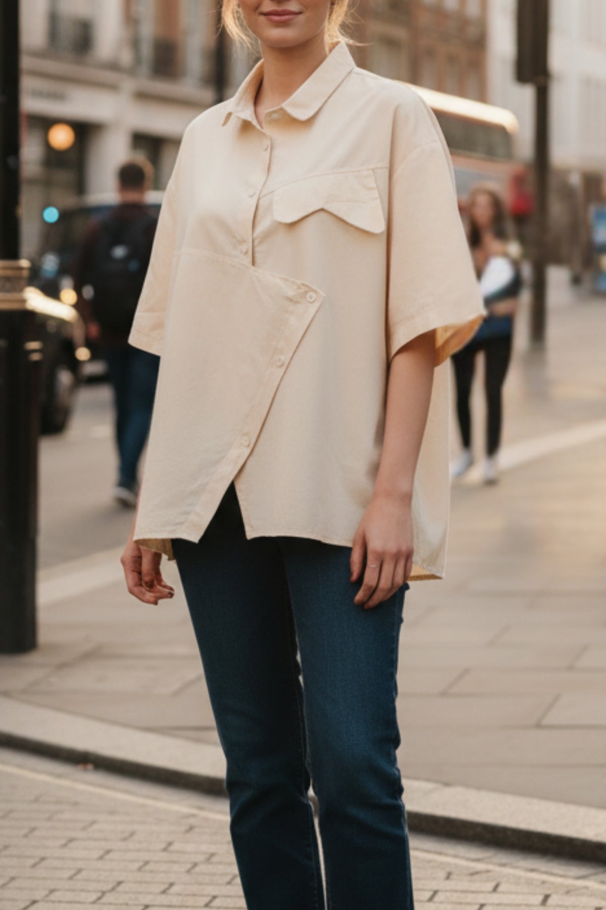 Step up your streetwear game with our Vanilla Essence Oversized Shirt. Boasting half sleeves and an intriguing asymmetric button flap placket, it exudes a unique flair that adds a stylish edge to any ensemble. Flaunt your fashion-forward sensibilities with this standout piece.