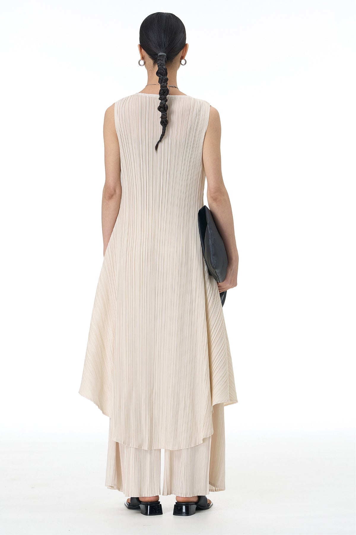 Vanilla Dream Pleated Co-Ord Set is designed for modern minimalism with a soft, refined edge. Crafted in lightweight pleated fabric, the sleeveless top flows beautifully over wide-leg pants, creating a balanced silhouette that moves with ease. The subtle texture and airy drape make this set perfect for warm days and elevated everyday dressing.