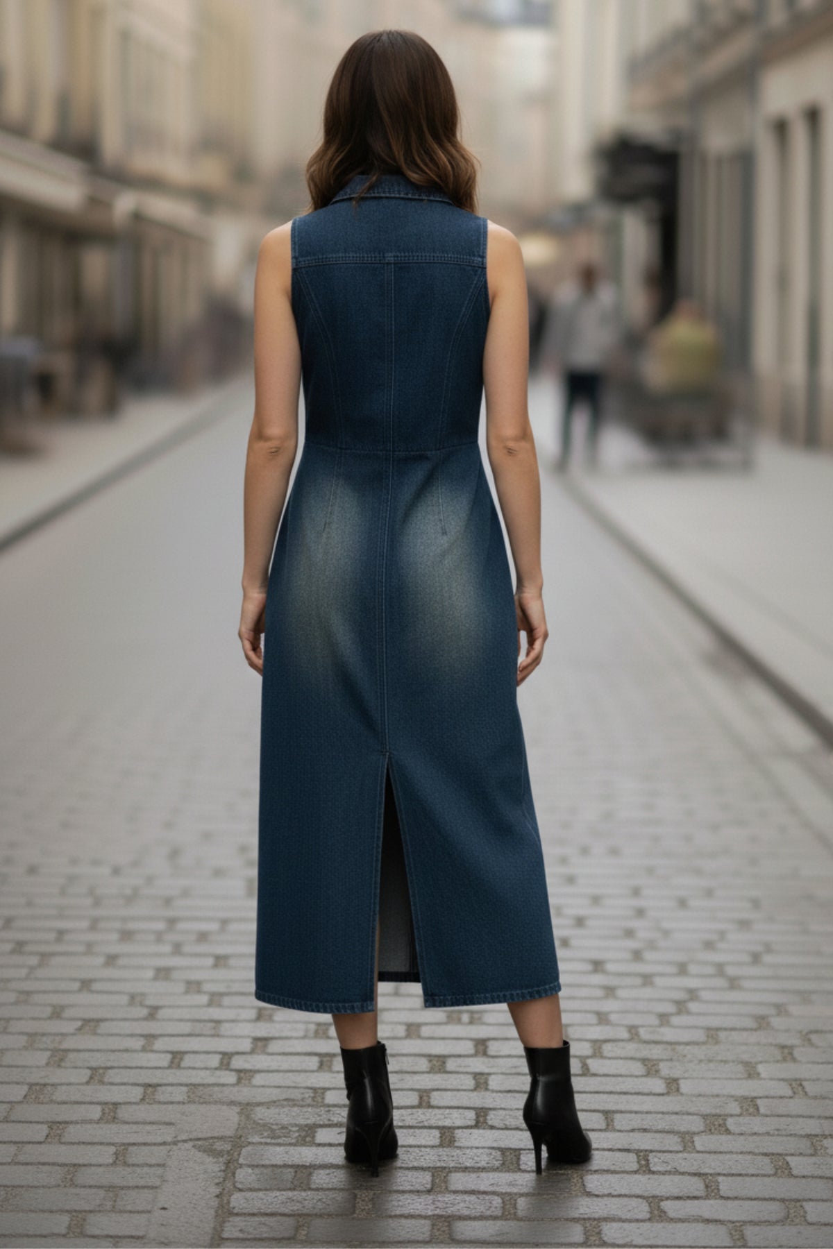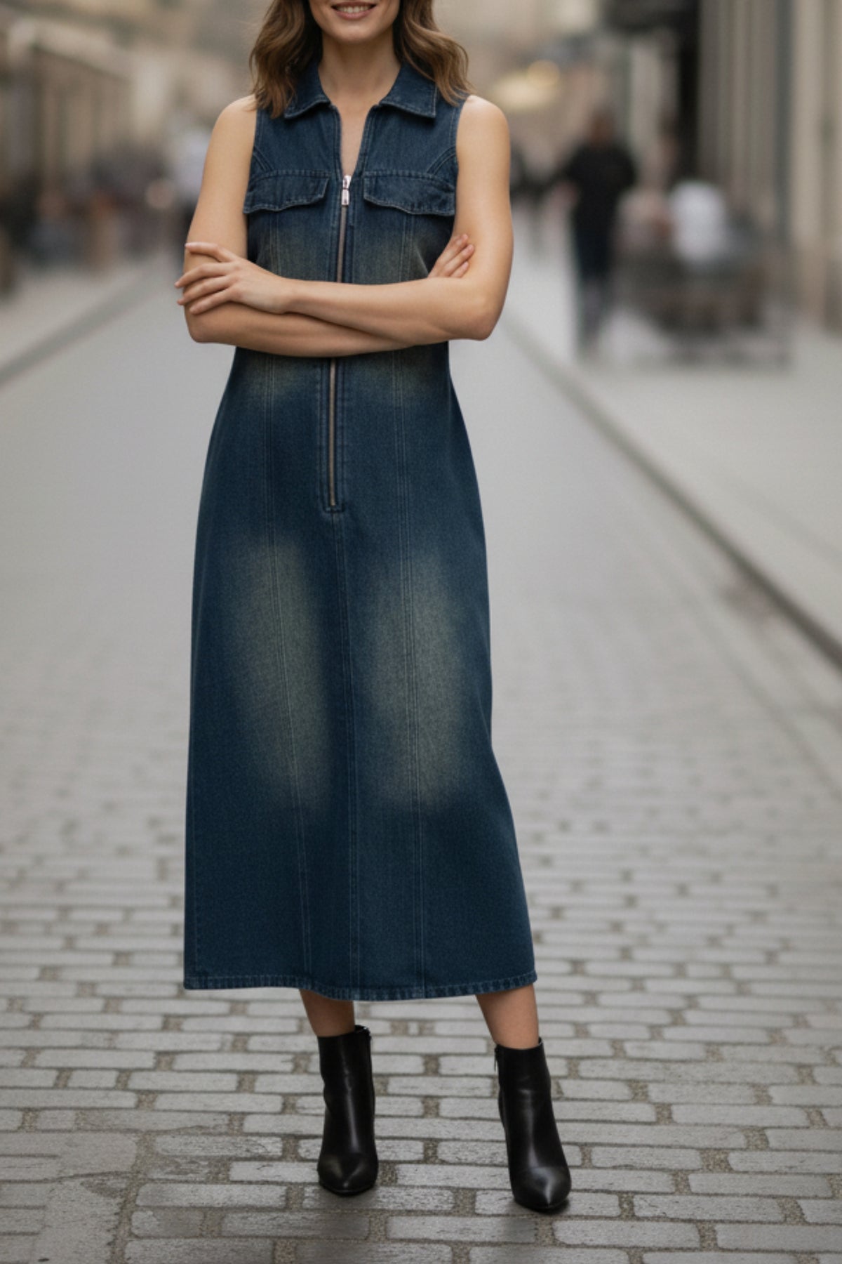 Step into effortless edge with the Nightfall Denim Zippered Dress, crafted for women who love bold, clean, and contemporary silhouettes. This sleeveless denim midi dress features a flattering fitted shape, a front full-length zipper, and structured utility pockets that add a modern twist. The soft faded wash enhances the bodyline, giving it a sleek yet relaxed appeal. Perfect for day-to-night styling, it brings together comfort, confidence, and undeniable style.