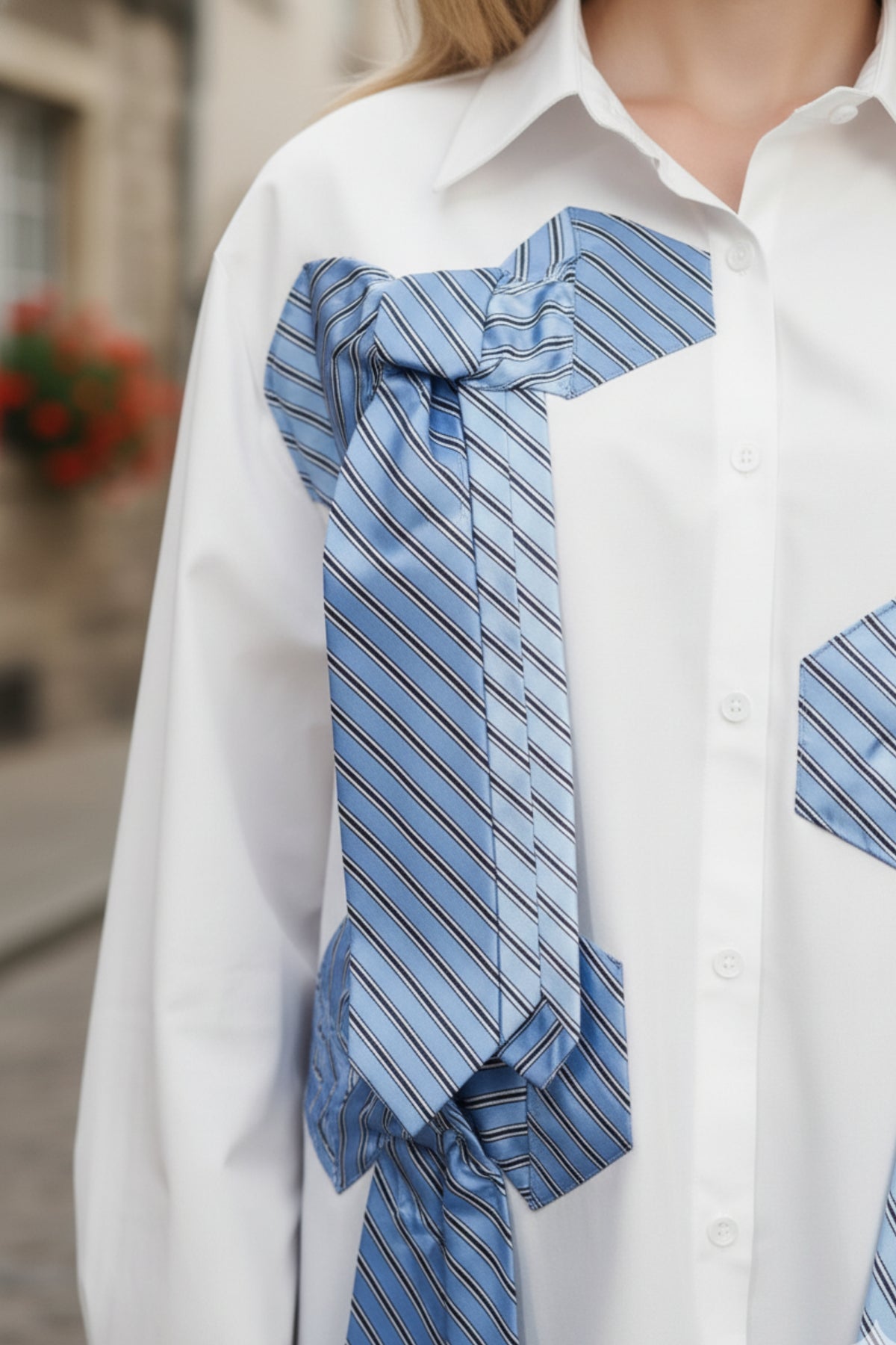 A playful twist on formal, this white Coquette button-down shirt features statement tie-bow accents with striped embellishments—classic with a cool edge.