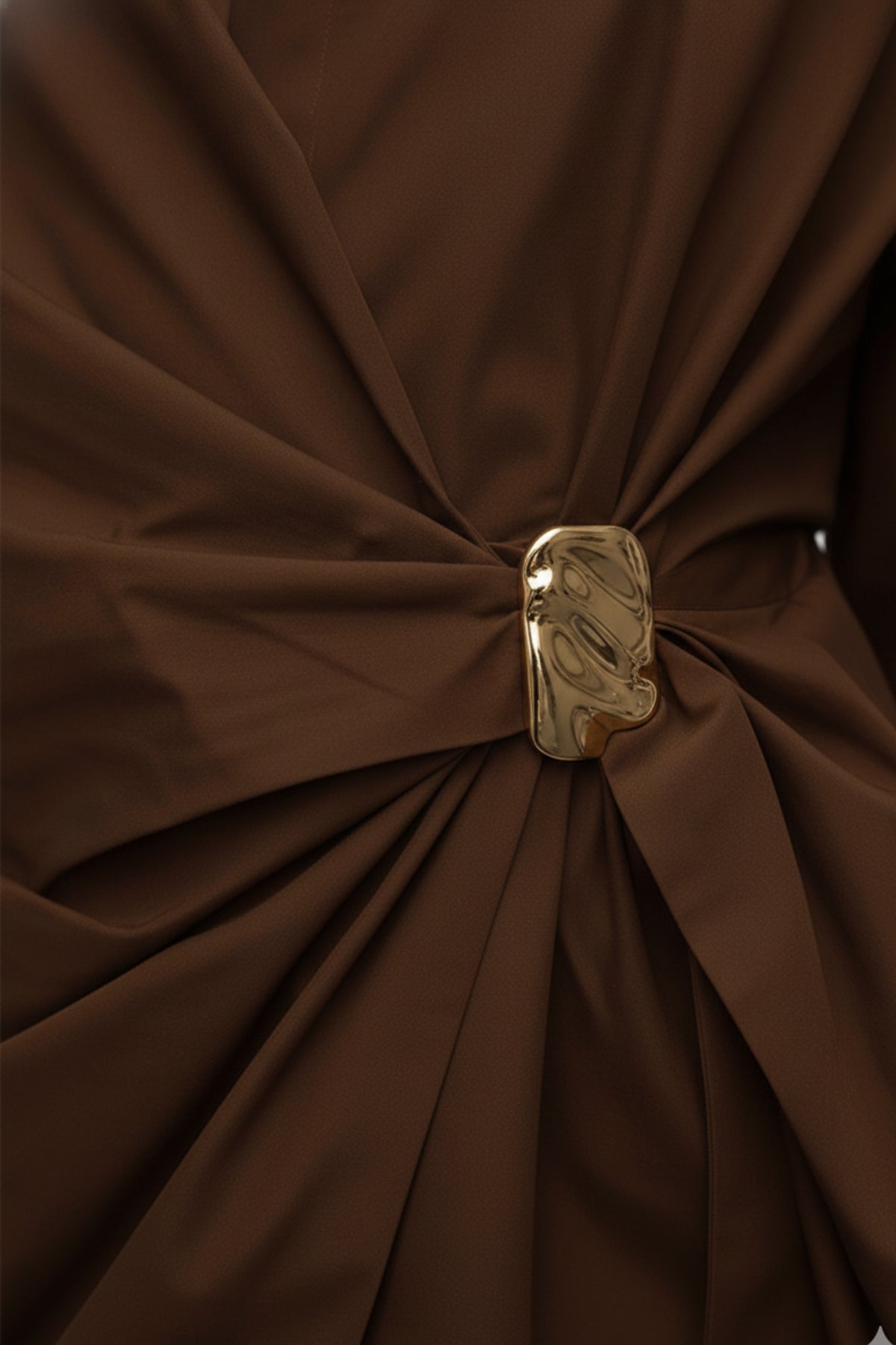 - Details: Asymmetric drape with metallic buckle accent