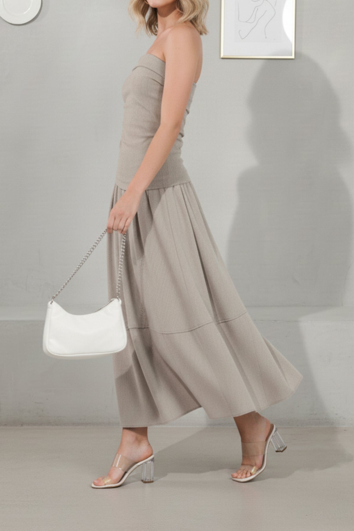 This Beige Bandeau Linen Top & Skirt Set features a Beige Bandeau Top with a smocked elasticated panel at the back, silicon grip in the front and ruching at the waist. It is paired with a long flared skirt with an elasticated waistband and side pockets.