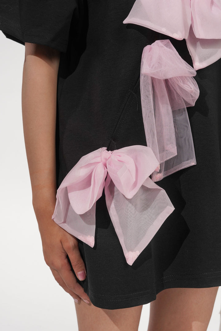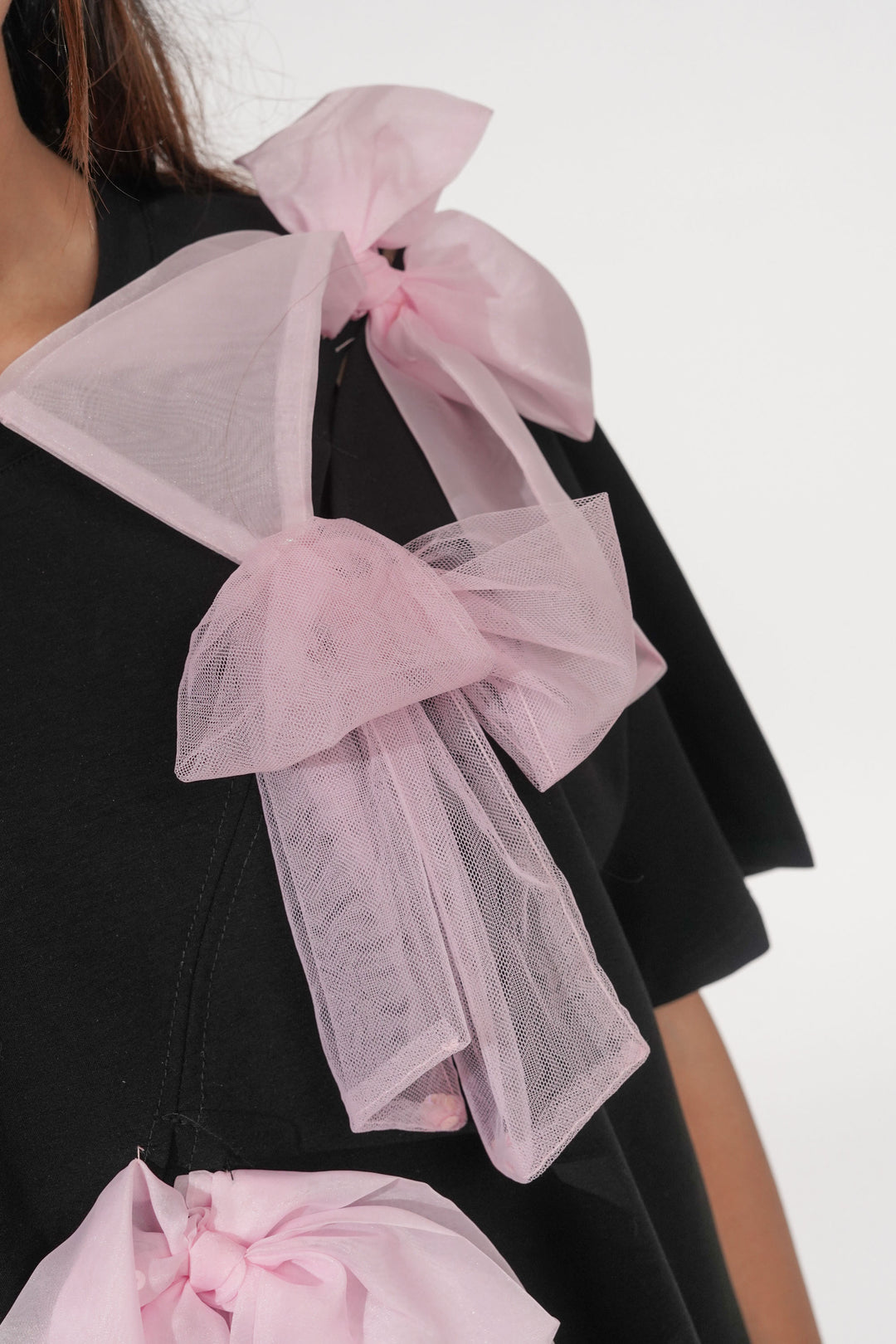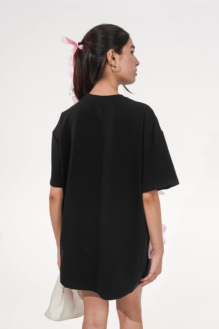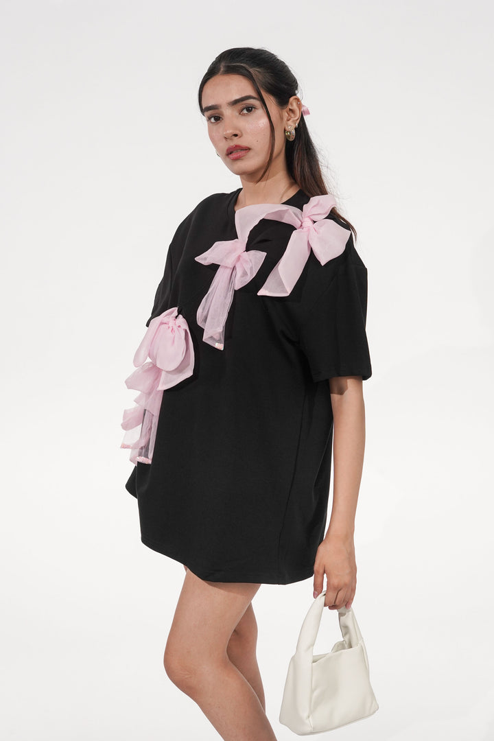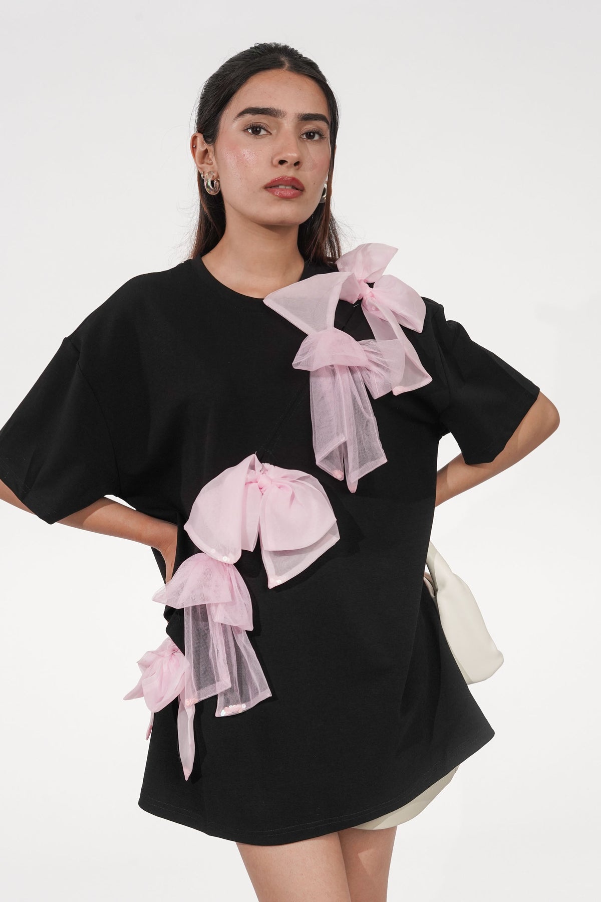 The Bonita Bows Black T-Shirt is a playful twist on a wardrobe essential. Crafted from a soft cotton-blend fabric, it features an oversized fit with short sleeves for everyday comfort. Eye-catching pink bows in organza & net, diagonally placed across the front along with slight cutouts that add a unique & feminine charm.