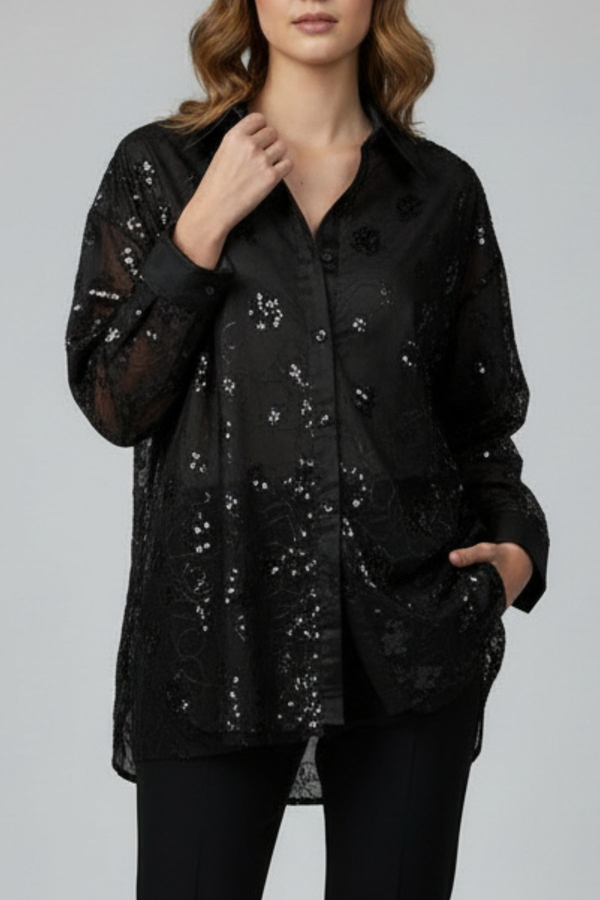 Make a statement with the Noir Mesh Sequin Layered Shirt, where minimal elegance meets playful sparkle. Crafted from a soft cotton blend, this shirt offers a relaxed yet refined fit. The long sleeves with buttoned cuffs give it a polished structure, while the scattered sequin and bead floral motifs add a touch of modern glamour.