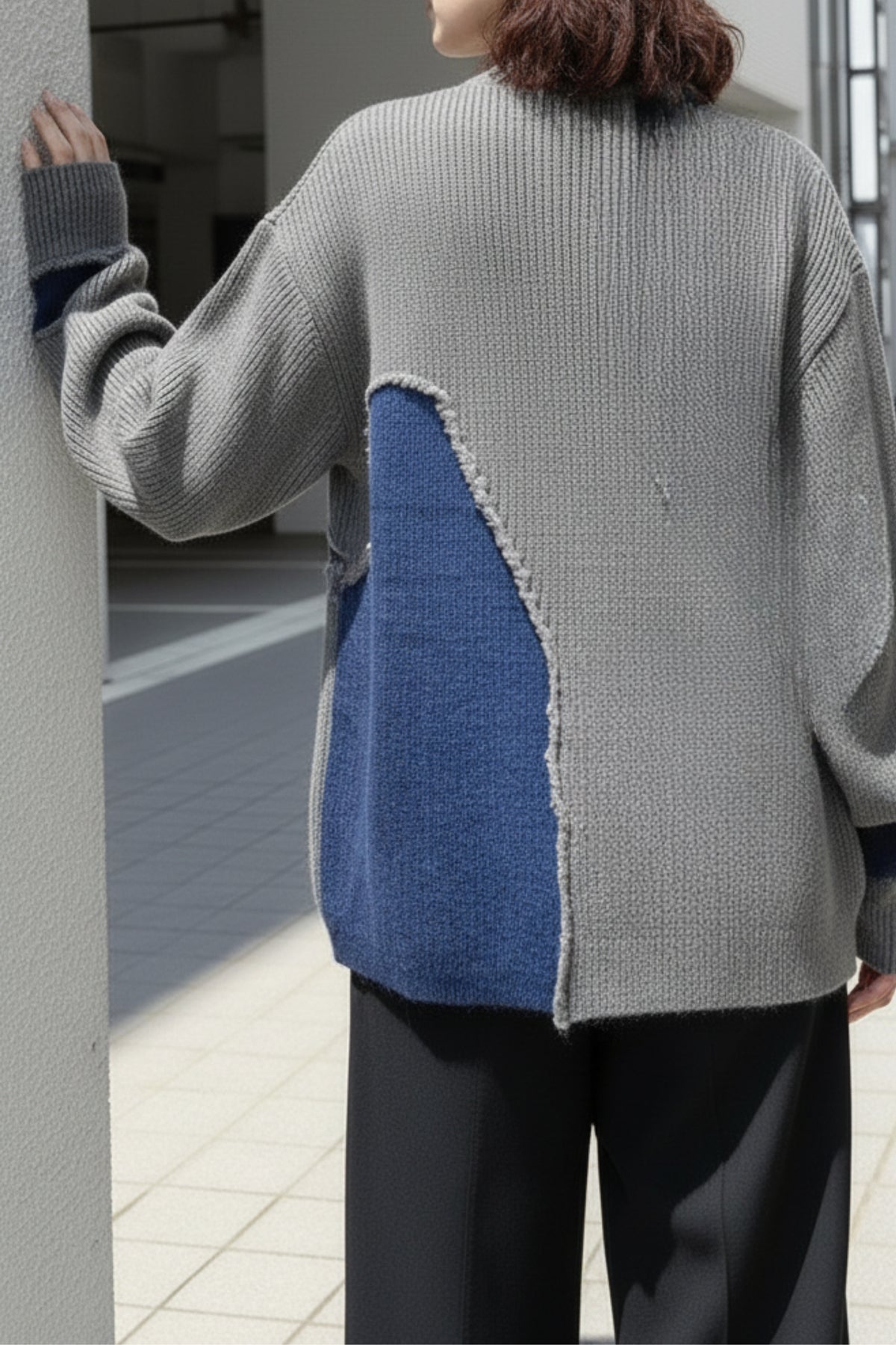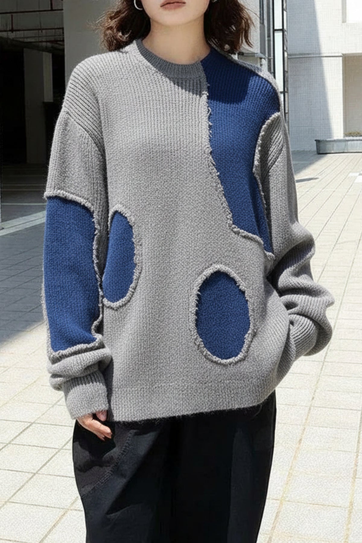 This grey intarsia knit sweater features blue oval-shaped applique patterns, adding a unique touch to its soft, textured design. It comes with a ribbed neckline, full sleeves, and ribbed cuffs for a comfortable, fitted look. Perfect for both casual and refined outfits, this sweater combines style and warmth effortlessly.