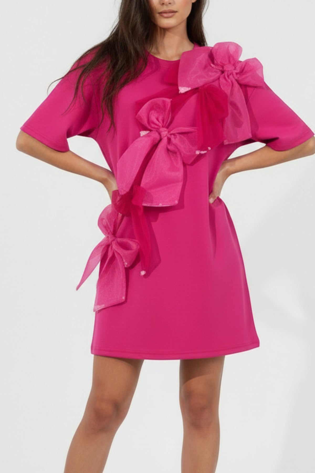 The Bonita Bows Barbie Pink T-Shirt is a playful twist on a wardrobe essential. Crafted from a soft cotton-blend fabric, it features an oversized fit with short sleeves for everyday comfort. Eye-catching pink bows in organza & net, diagonally placed across the front along with slight cutouts that add a unique & feminine charm.