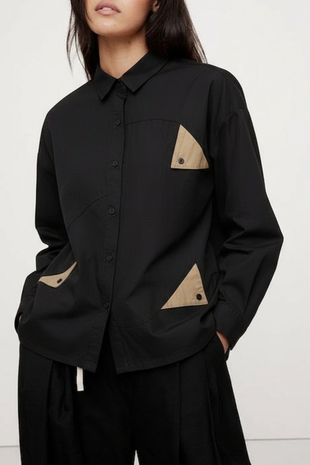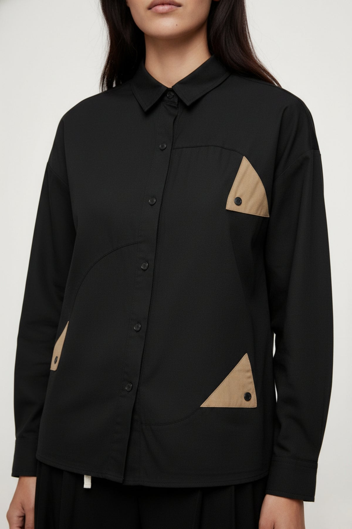 Elevate your wardrobe with this full-sleeve black shirt, featuring a button-up design with asymmetrical panels in front. The standout triangular olive-colored flaps, adorned with buttons, add a unique touch. Perfect for both casual and smart-casual occasions, this shirt effortlessly blends style and sophistication.