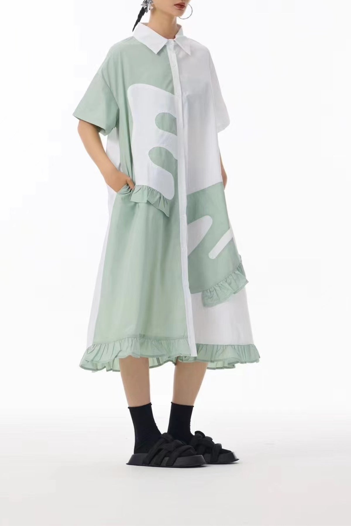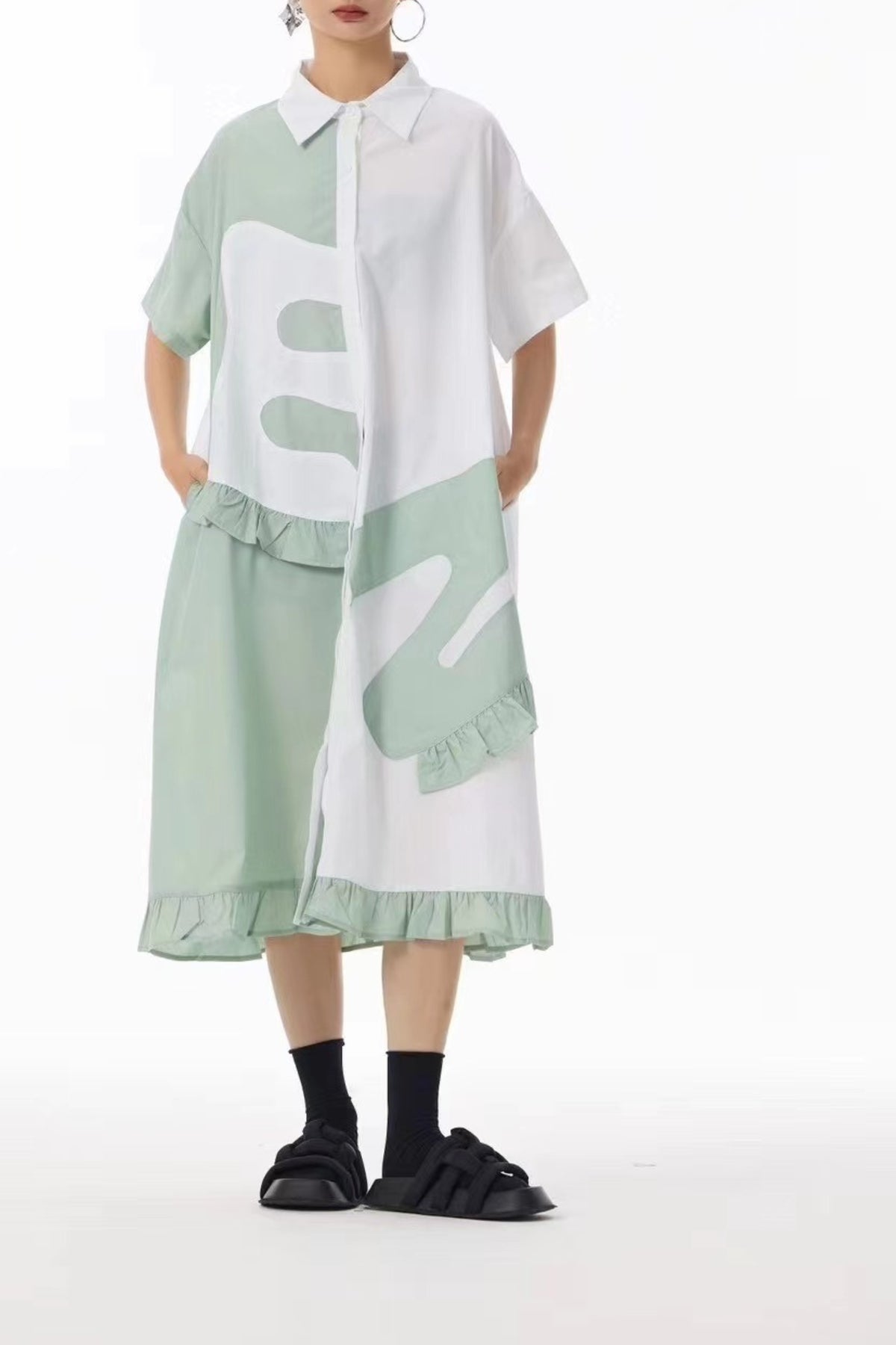 The EZ Color blocked Shirt Dress is a statement piece with a relaxed silhouette. Made from a soft cotton blend, it features an oversized fit for all-day comfort. The short sleeves and button-down front are elevated with bold asymmetrical color-blocking and ruffle details, adding a playful yet modern edge.
