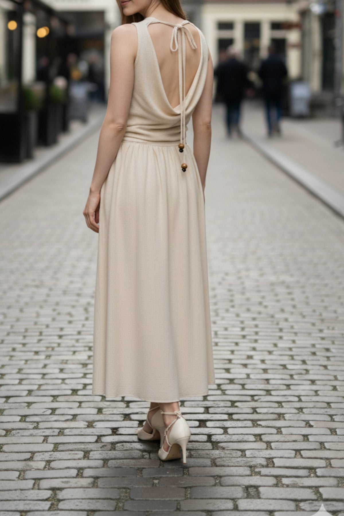 - Details: Back cowl drape, tie-up strings with bead accents, layered waist detail