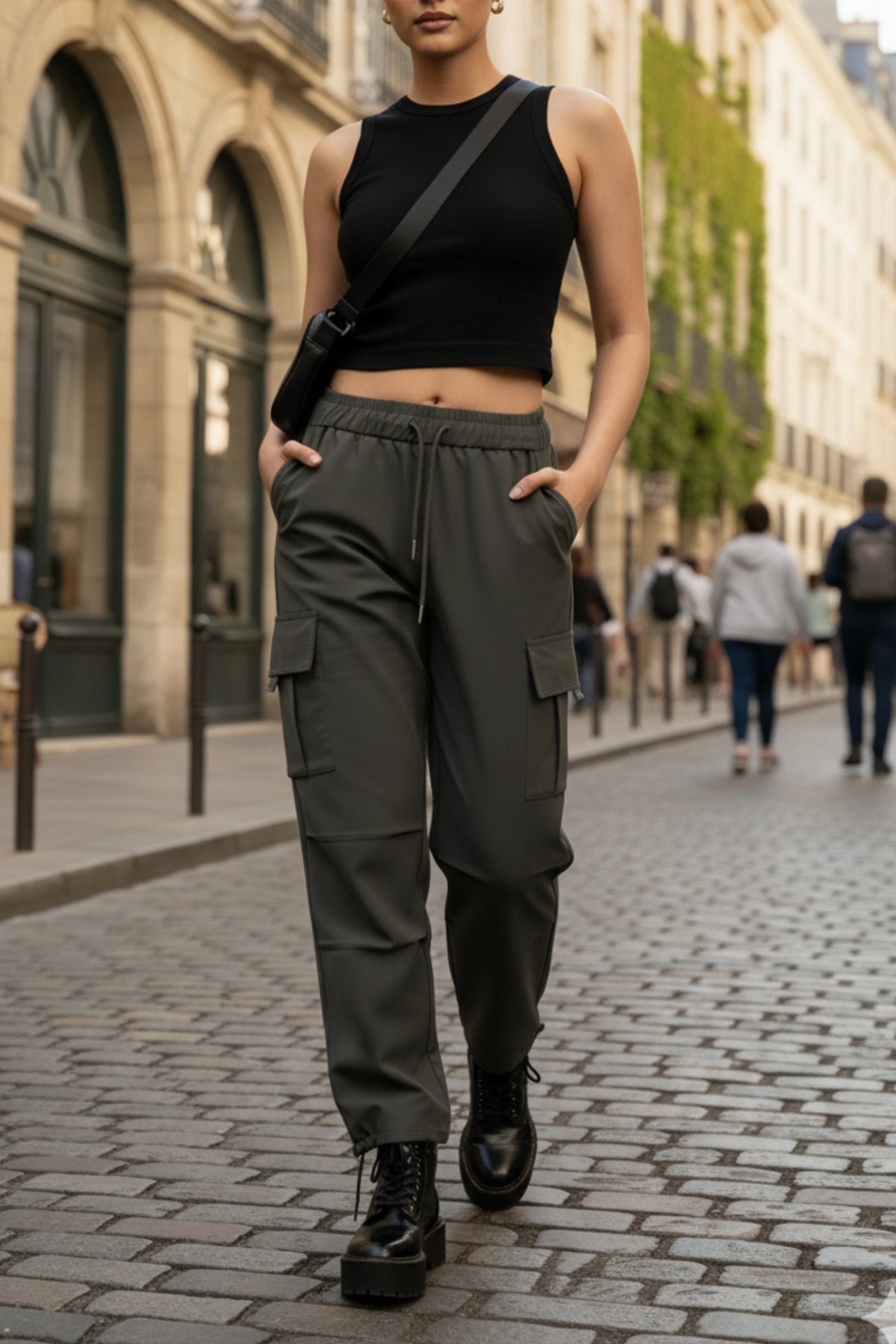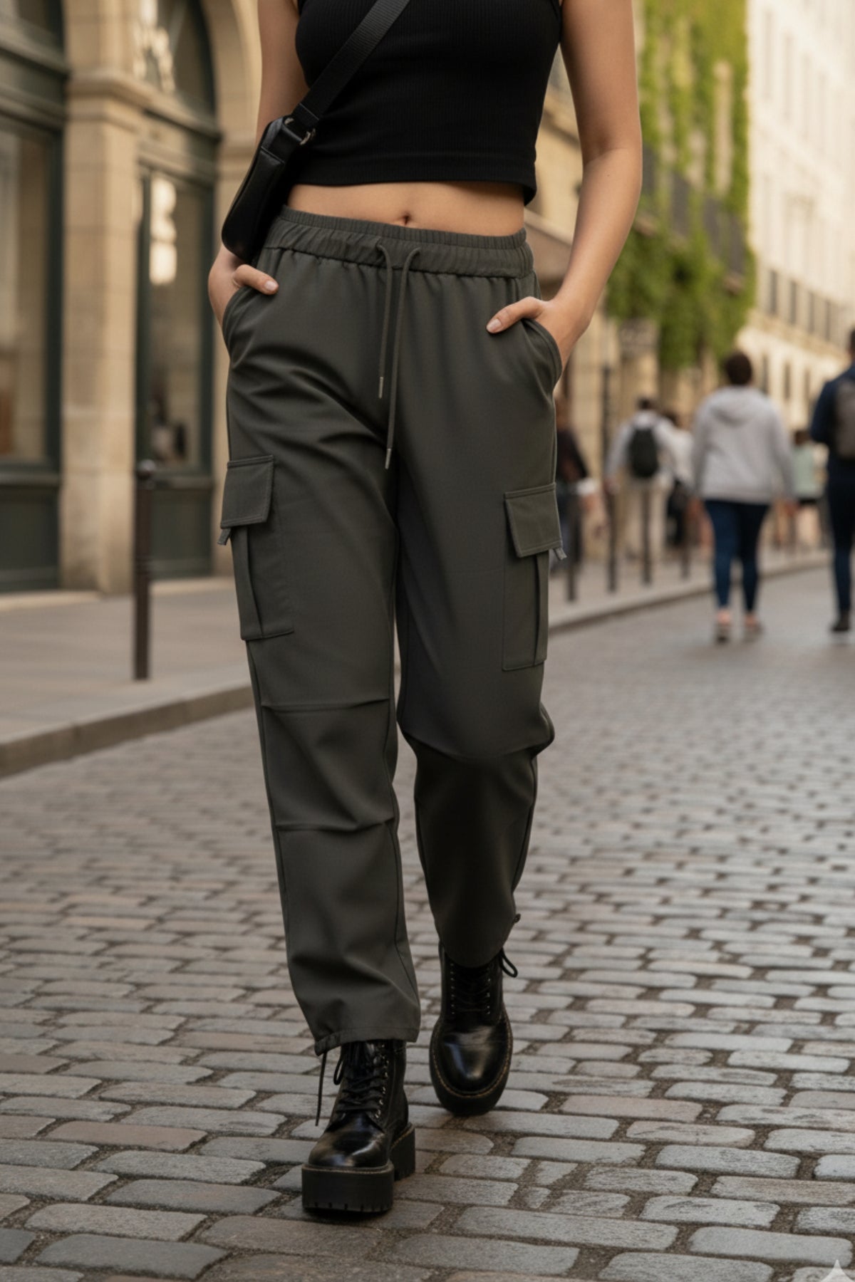 Experience comfort and style in our versatile Graphite Utility Cargos. The elasticated waist with a drawstring ensures a tailored fit, while side and cargo flap pockets add functionality. The drawstring at the pant opening allows for a customizable look. Elevated by knee detailing, these trousers seamlessly blend casual and chic, making them a wardrobe essential for a modern, dynamic aesthetic.