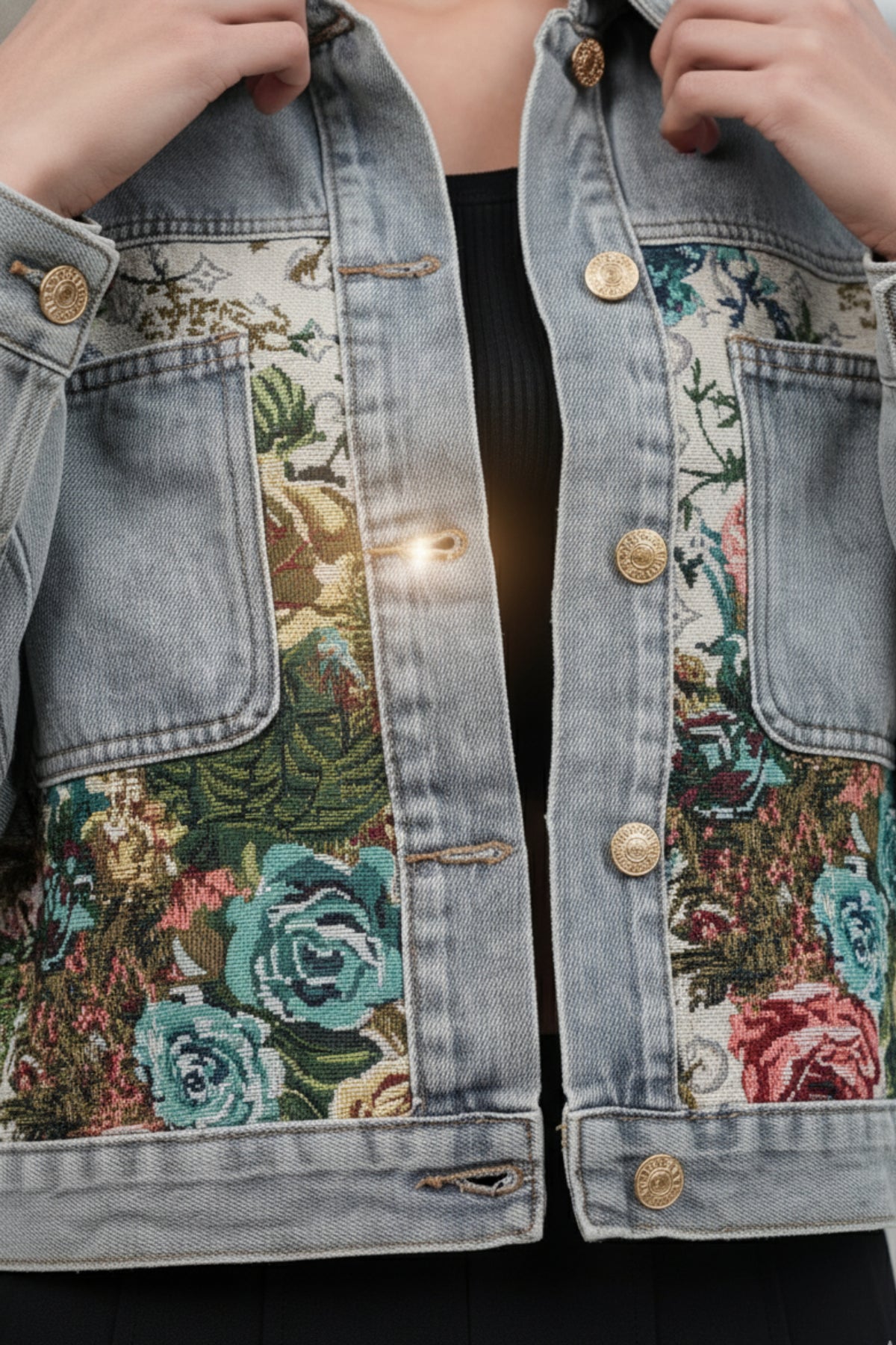 This Slate Grey Denim Jacket effortlessly blends classic style with a touch of floral charm. Crafted from woven denim, it features intricate floral patterns that add texture and depth to the jacket. The golden textured buttons enhance its refined look, while the classic collar offers a timeless touch. The pockets are beautifully integrated onto the floral fabric, designed in a complementary slate grey color for an elegant contrast.