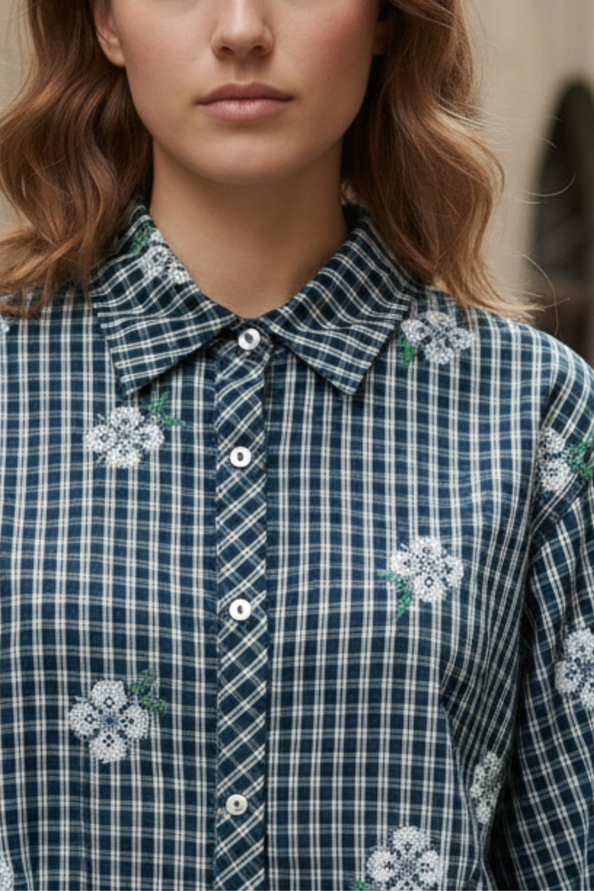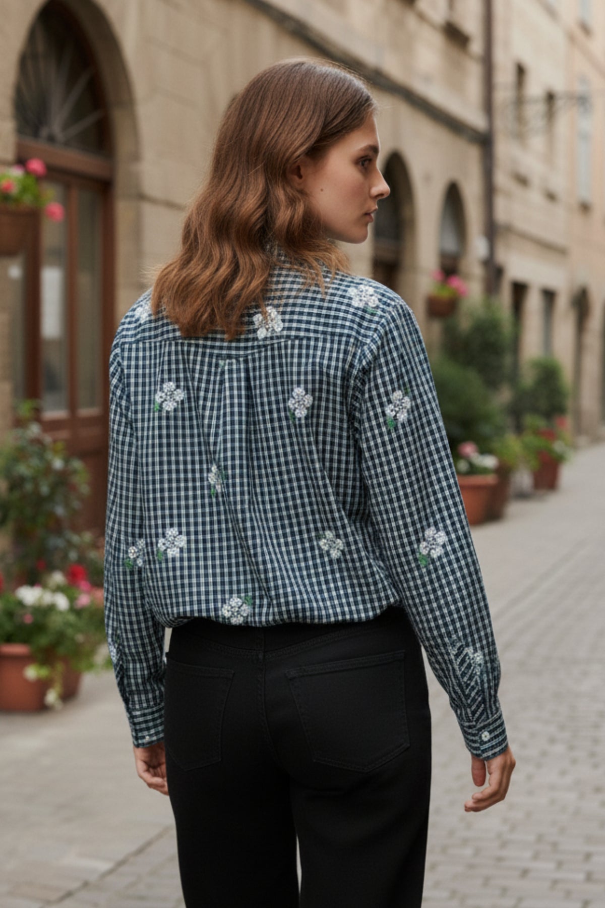 The Midnight Garden Plaid Shirt combines classic checks with floral charm. Crafted from soft cotton blend fabric, it features a relaxed fit, long sleeves with buttoned cuffs, and a collared neckline for timeless appeal. The shirt is elevated with embroidered floral details, adding a touch of elegance to its casual design.