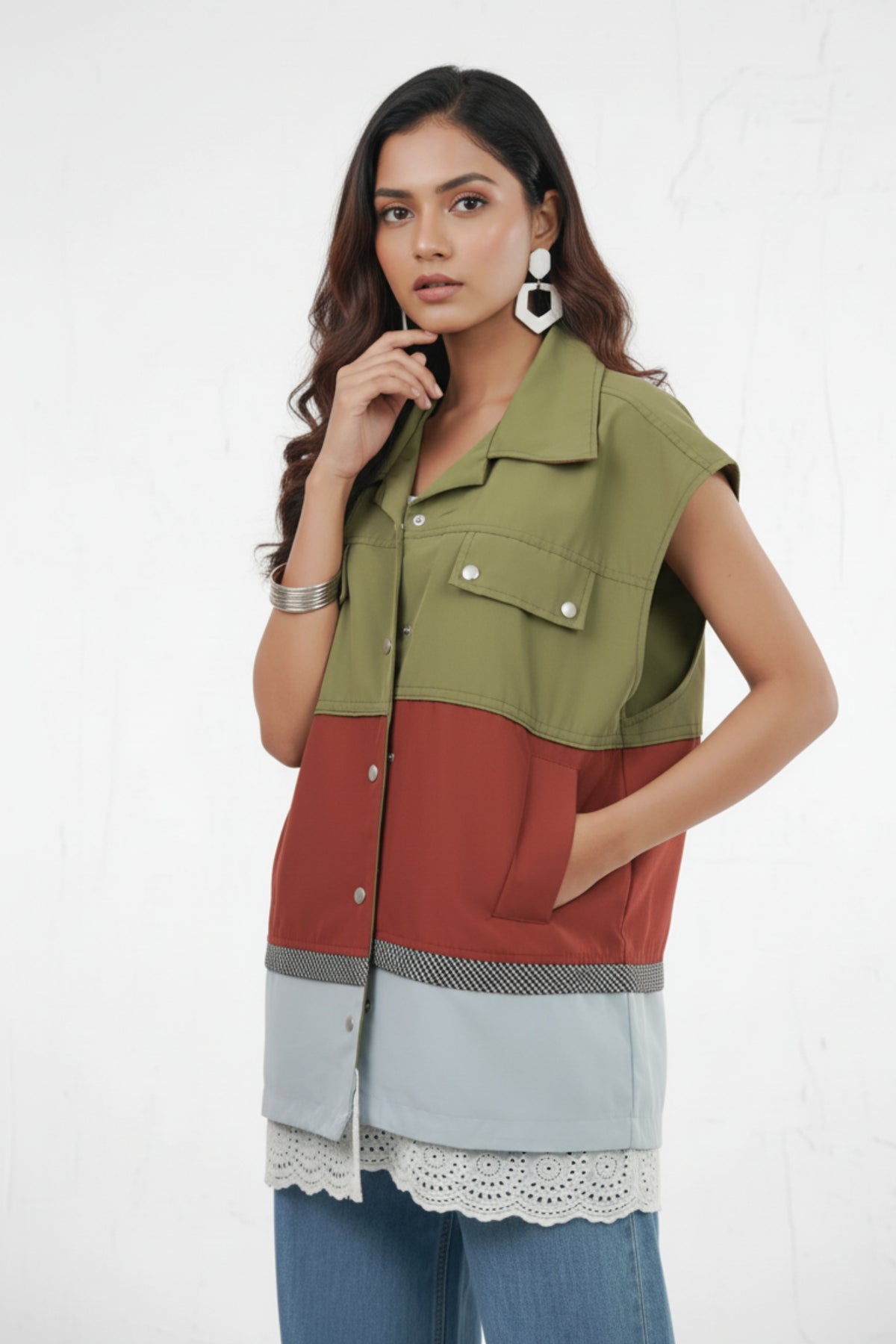 The Autumn Forest ColorBlock Jacket features bold panels of olive, rust, and blue with a touch of houndstooth. Finished with utility pockets, snap buttons, and lace trim, it's a structured yet playful sleeveless layer.
