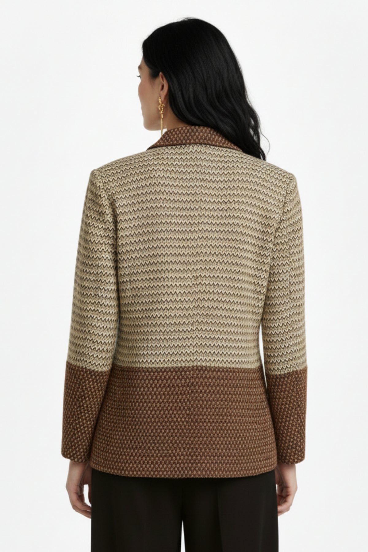 The Botanical Zigzag Floral Blazer is a refined statement piece that blends tailored structure with artisanal charm. Crafted in a textured zigzag weave, it features delicate floral appliqué with subtle bead accents, adding depth and character to its design. The classic lapel collar and button-front closure keep the silhouette timeless, while the earthy multitone palette makes it easy to style.