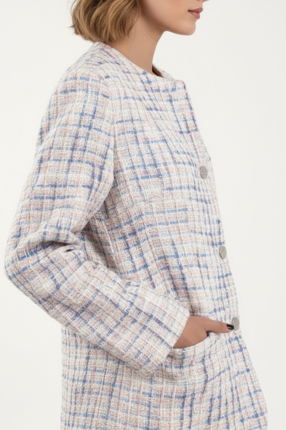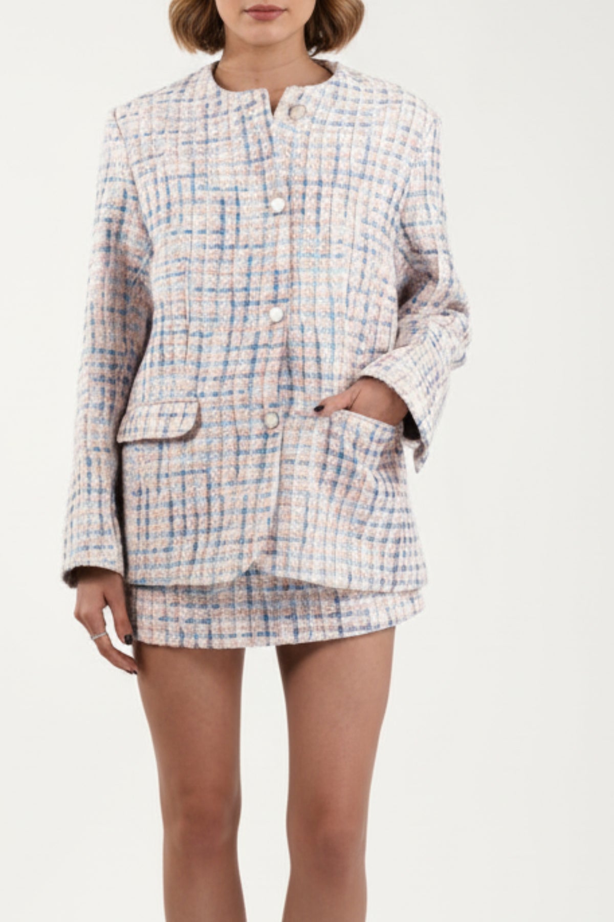 This pretty white woven tweed set is a combination of a beautiful multicolor tweed mini skirt and blazer set. This comes with a wide 3-inch dangling waist belt for women, with a silver buckle and eyelets adjustable to fit sizes S/M and L/XL, respectively. The blazer is decorated with pearl white buttons and 2 flap pockets. Plus, the blazer inside is lined with soft material and comes with an additional pocket. The mini skirt is elasticated on the back and has a side zipper for a better fit.