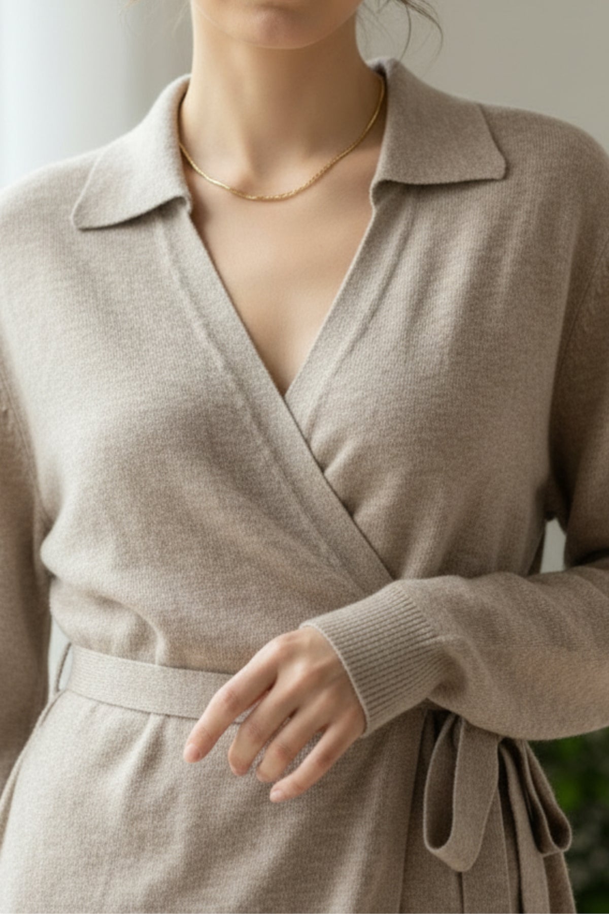 A refined wrap-style top designed for effortless layering and everyday elegance. Crafted in a soft knit with a fluid drape, this piece balances comfort with a polished, modern silhouette.