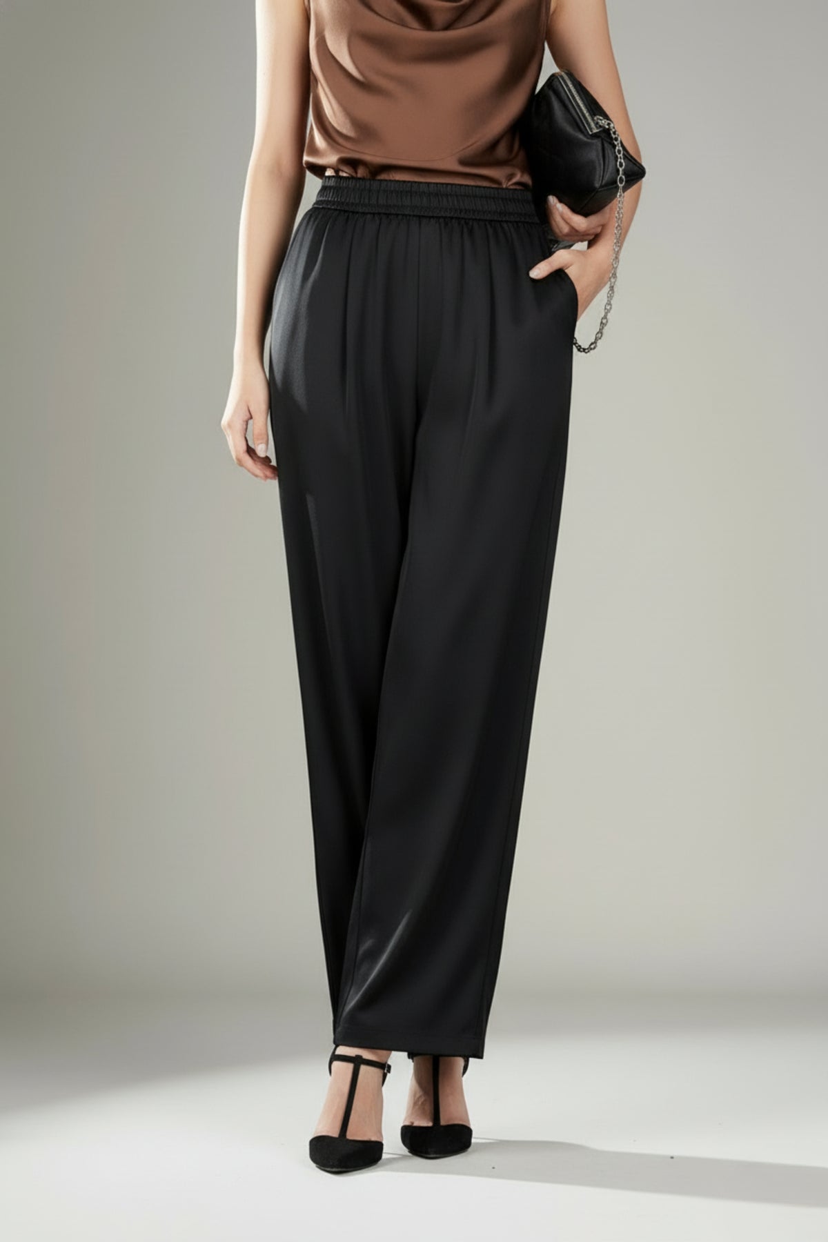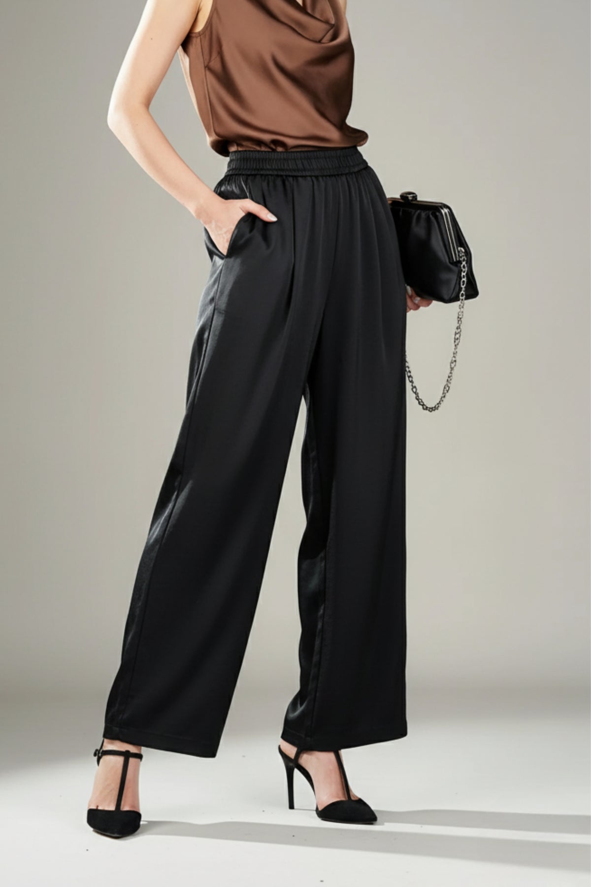 Introducing Drift Black Wide Leg Satin Pants: Immerse yourself in the pinnacle of elegance and comfort. Crafted from opulent textured satin, featuring practical side and back pockets. With an elasticated waist ensuring a personalized fit, they radiate timeless sophistication for any occasion.