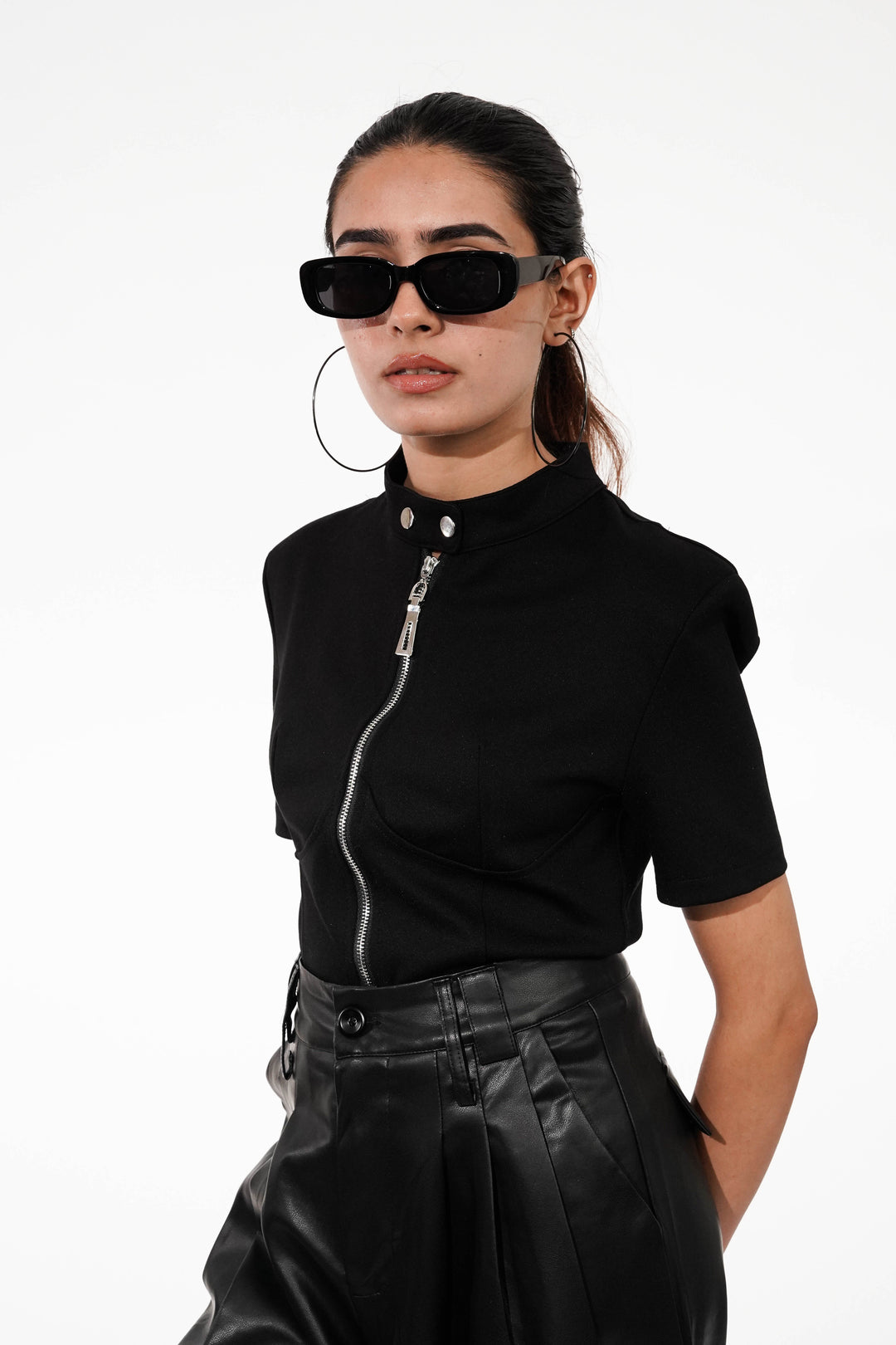 This Elordi Zippered Top Command attention with the Elordi Zippered Top—a bold, sculpted essential for the fashion-forward. Featuring a structured bustier silhouette, shoulder pads and a full-front zipper, this cropped top adds instant edge to any outfit. The short sleeves and snap collar give it a sleek, utilitarian twist, perfect for layering or wearing solo.