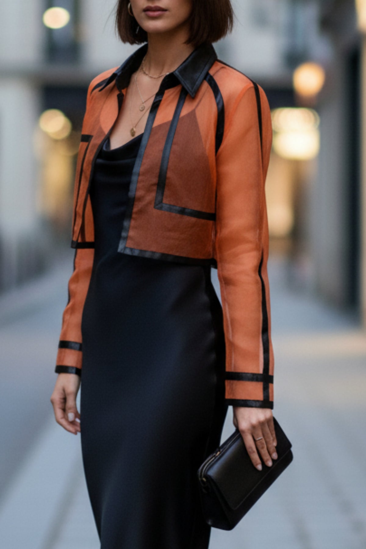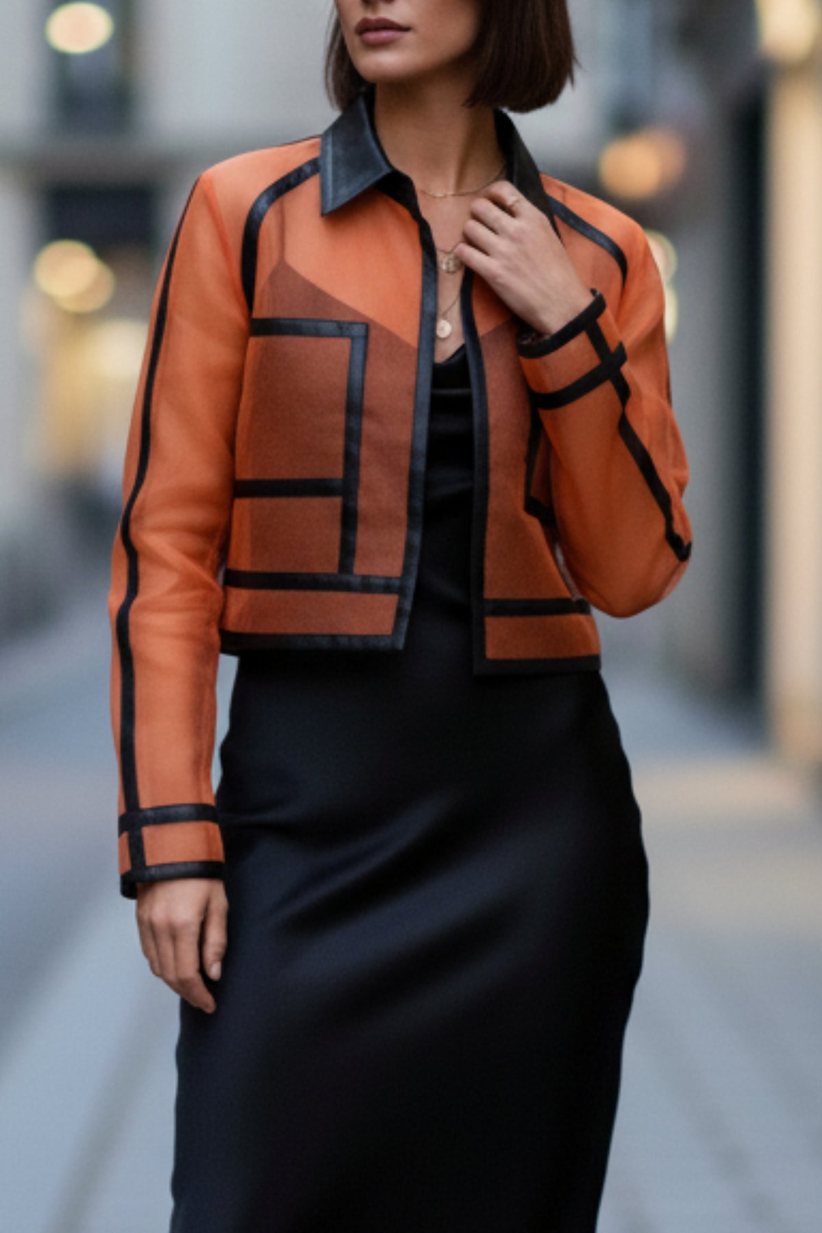 Make a statement with our vibrant orange crop jacket, crafted from lightweight organza. Featuring chic faux leather outline detailing and a classic collar, this jacket combines playful elegance with structure, making it the perfect layering piece for any occasion. Embrace bold style.