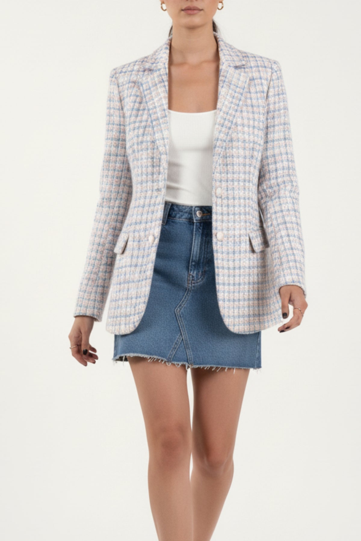 This pretty white woven tweed set is a combination of a beautiful multicolor tweed mini skirt and blazer set. This comes with a wide 3-inch dangling waist belt for women, with a silver buckle and eyelets adjustable to fit sizes S/M and L/XL, respectively. The blazer is decorated with pearl white buttons and 2 flap pockets. Plus, the blazer inside is lined with soft material and comes with an additional pocket. The mini skirt is elasticated on the back and has a side zipper for a better fit.