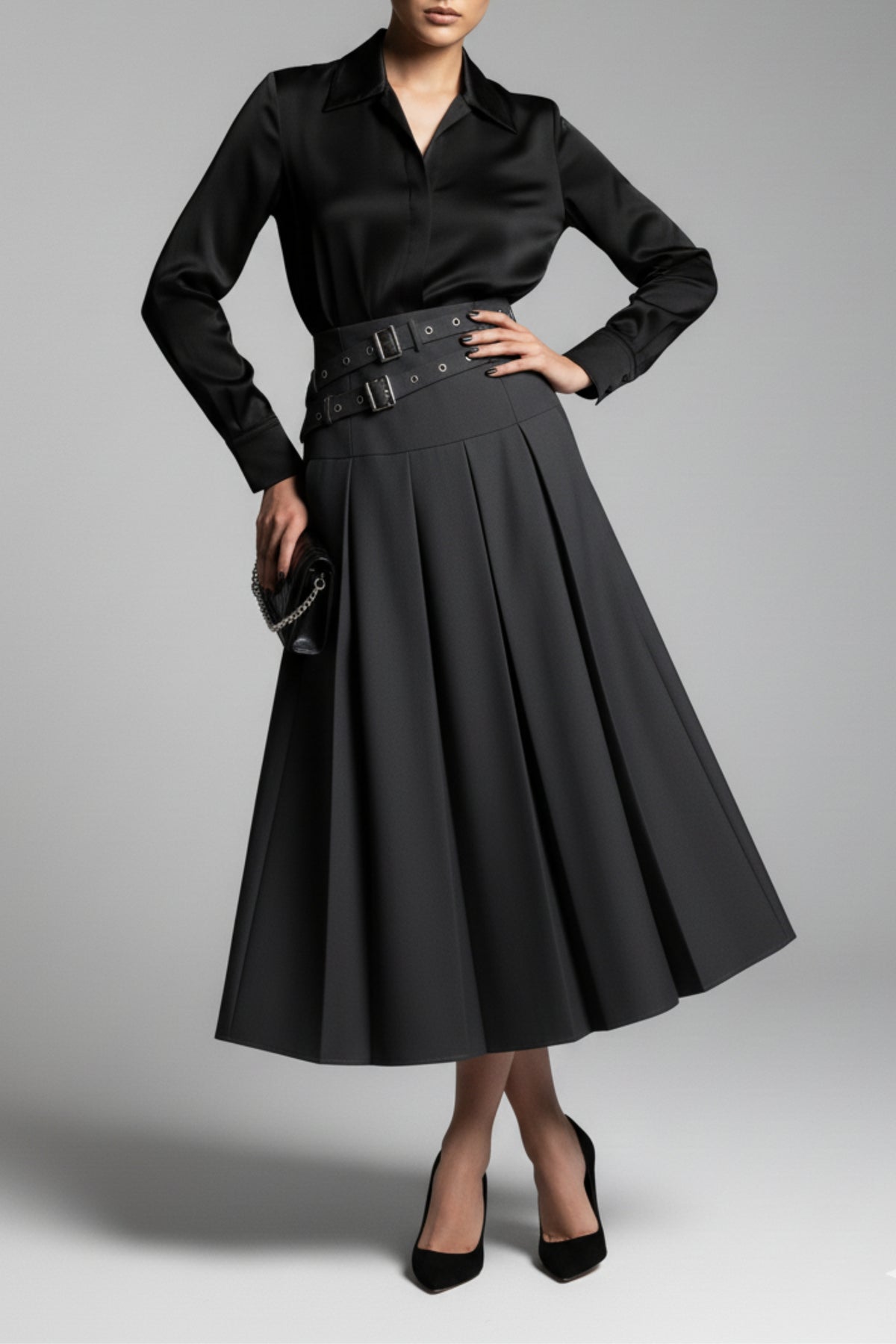 This midi pleated skirt in Gray features a high waist design for a flattering silhouette. The unique silver buckled belts, placed across the waist panel, add an edgy, stylish touch. With a back zip closure for a secure fit, this skirt effortlessly blends modern style with timeless elegance. Perfect for any occasion, it pairs easily with both casual and dressy outfits.