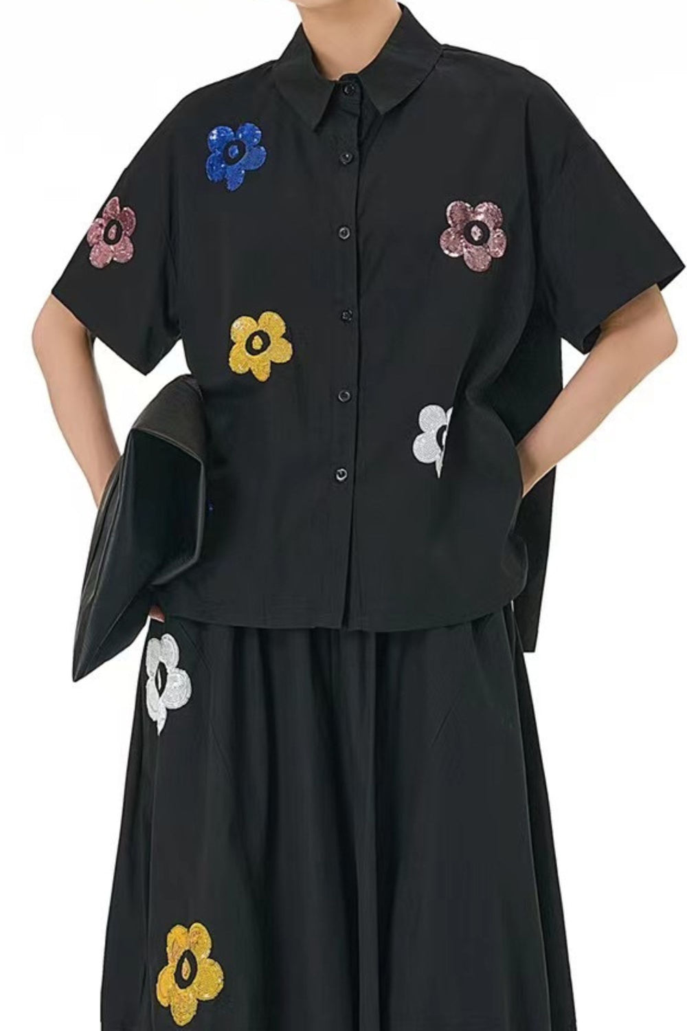 Elevate your wardrobe with our Twinkling Black Floral Oversized Shirt, featuring floral motifs adorned with sparkling sequins. This exquisite piece seamlessly blends comfort and elegance, offering a perfect choice for making a bold fashion statement